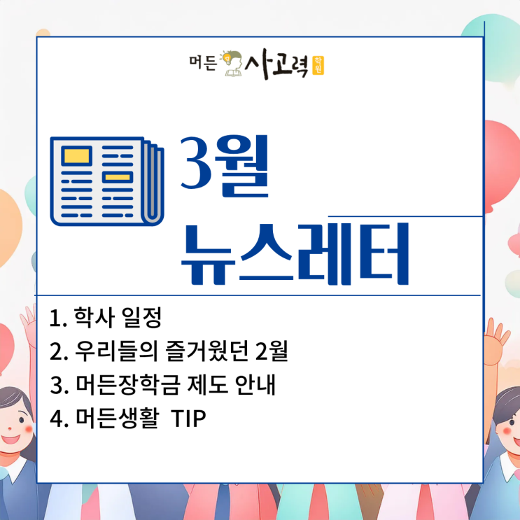 새 학년, 새 학기가 시작되는 3월입니다. 이 시기에는 무엇보다도 생활 리듬을 잘 찾아가는 것이 중요합니다. 적어도 개학 3일 전부터는 학교 시간표에 맞추어 생활하는 습관을 되돌려주세요. 3월도 화이팅입니다!! 2월을 잘 보낸 친구들 새 학기에도 그 생활 리듬 그대로 잘 적응하리라 믿습니다. 학습에 대한 열정을 만들어주기 위한 장학금 제도. 선생님 통장은 텅텅 비어도 괜찮아~~. 3월도 책과 친해지는 우리 친구들 되길 바랍니다. 특히 수학, 과학 책을 많이 읽었으면 해요~. <img src="https://blogthumb.pstatic.net/MjAyNjAyMjVfMjc3/MDAxNzcyMDAyMTAyOTQx.zozhYlMFxoVJ_-S10X7R0txA8PQUgxgAx26CxM5n58gg.LRVa3KsZD67KIVdE5tH5A1S4gwdFf1yjndafid-53hQg.PNG/1.png?type=s3" />