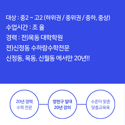 20년동안의 노하우!! 1등급은 가르치지 않습니다. 1등급 만들어 드리겠습니다. “실전에서 효과적인 풀이로 가르치겠습니다. 수학을 싫어 하는 학생. 아무리 공부 해도 성적이 안 오르는 학생. 수학을 포기 했던 학생. 킬문항에서 항상 발목이 잡히는 학생. 자존감을 잃은 학생. 차근 차근. 20년의 노하우로 성장 시켜 드리겠습니다. 양천고 / 백암고 / 신목고 / 광영고 / 신서고 / 화곡고 / 마포고 / 광영여고 / 명덕여고 / 경복여고 / 양정고 / 다수 외고와 과고 <img src="https://blogthumb.pstatic.net/MjAyNTEyMDZfNjEg/MDAxNzY0OTc4MjI2NjA3.v9nfWp97p6AncA49DcREYn5w0AMserN1Bpdq6sarQzQg.HBoxRPcWtPH3Npms1vlZYfMcOgyCfi-kUrvNLKwJI1sg.PNG/3.png?type=s3" />