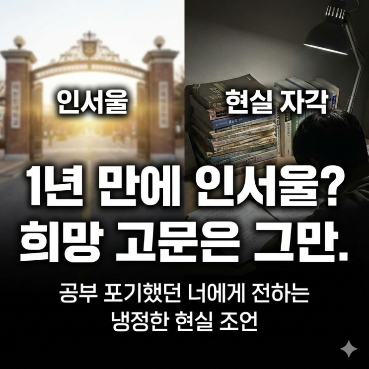 상담실 문을 두드리는 학생들 중 뒤늦게 공부에 뜻을 품고 찾아오는 친구들이 있습니다. "선생님, 저 그동안 공부 안 했지만 1년 정말 미친 듯이 해서 인서울 하고 싶어요." 그 결심과 열정은 정말 높이 삽니다. 하지만 저는 교육자로서 무책임하게 "할 수 있다"는 달콤한 말만 건넬 수는 없습니다. 1년이라는 시간은 길어 보이지만 입시라는 거대한 벽 앞에서는 순식간에 지나가는 시간이기 때문입니다. 오늘은 '노베이스 1년 인서울'이라는 목표가 현실적으로 얼마나 험난한 길인지 그리고 성공 확률을 1%라도 높이려면 무엇을 따져봐야 하는지 아주 냉정하게 이야기해 보려 합니다. 너의 '시작점'은....... <img src="https://blogthumb.pstatic.net/MjAyNjAxMDZfMjQ4/MDAxNzY3NzAxNjM2MDEw.WLIMCi3V058RzVzZ_2ugdbuKWElPDZseY0IxeZ3-dNMg.7u1eQzGB0dBCX6gcB5HTS6JfpEpfhEekJ6spnnBJjA0g.PNG/Gemini_Generated_Image_frmvvkfrmvvkfrmv.png?type=s3" />