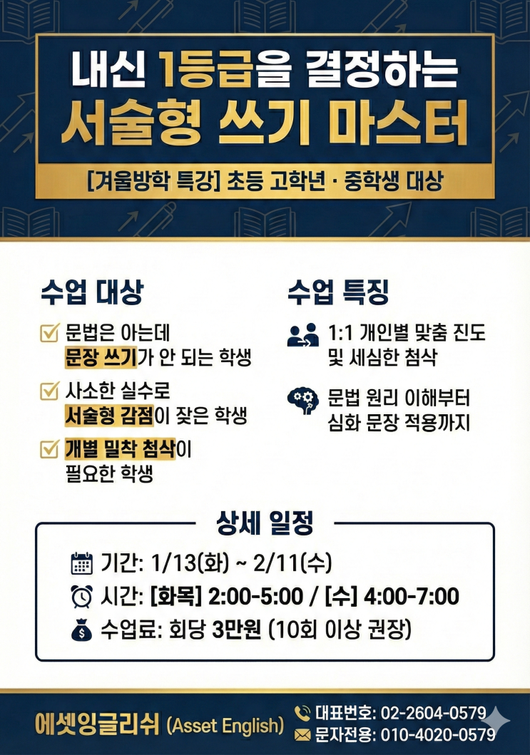 글쓰기 글쓰기,,, 롸이팅 롸이팅,,, 에세이 에세이 그러나,,, 점수로 이어지는 글쓰기는 부족한 경우가 많습니다. 아이들 수준에 따라 실수들이라도 불리는 작은 것들이 결국엔 오답으로 이어집니다. 이미 습관으로 굳어져 있는 부분은 개선되는데 많은 수고가 들어갑니다. 아이들이 스스로 써보고, 문법사항을 이해하고, 그것을 반영하고 리뷰하는 과정을 통해 드디어 완성형 문장이 만들어집니다. 고등 서술형까지 이어집니다. with Asset English 02-2604-0579 010-4020-0579 [문자] <img src="https://blogthumb.pstatic.net/MjAyNjAxMDlfMjIz/MDAxNzY3OTQxNTc0NTQ5.WC32ufhDEaZ5a-ROmcbx5u_sdHAS-IDdMJn3ld1vdFgg.DcjbtnROgybATYCr8s76p_67EfT3K3Jbdty0xO0gjK8g.PNG/%B0%DC%BF%EF%B9%E6%C7%D0_%B9%E6%C7%D0%C6%AF%B0%AD.png?type=s3" />