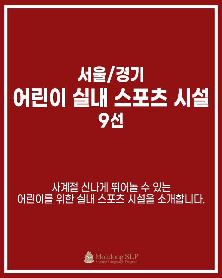 안녕하세요, 목동 SLP입니다. 추운 겨울에도 신나게 뛰어놀고 싶지만 한파, 미세먼지 등으로 어렵다면? 땀 쫙~ 뺄 수 있는 실내 스포츠 놀이 장소를 소개합니다. 트램폴린, 에어바운스, 클라이밍, 로프 타기 등 여러가지 스포츠 액티비티가 준비되어 있습니다. 사계절 내내 쾌적하고 안전하게 놀 수 있으니까 집에서 가까운 곳이 있는지 확인해 보세요. 1. 챔피언 더 블랙벨트 목동점 https://naver.me/FdCXilZ7 @mokdong_blackbelt 서울시 양천구 오목로 299, 이마트 목동점 B1 주요 컨텐츠 : 고공 놀이 구조물, 클라이밍 존, 슬라이드 코스, 스포츠 미션 트랙, 균형·협동 놀이존 2. 챔피언1250 아이파크몰 용산점 https://naver.me/FvEgeStH @y....... <img src="https://blogthumb.pstatic.net/MjAyNjAxMjdfODMg/MDAxNzY5NDg5OTE0MjEx.QEPsR-3cmc16EnsdErf0-as-1gQY6CoDIdXwrZ7Ni-Yg.q6KE56t_5hpaGF-BaKjusklZSC1kK_xZQYr9m9CqHDgg.JPEG/%C7%A5%C1%F6_%BA%B9%BB%E7.jpg?type=s3" />