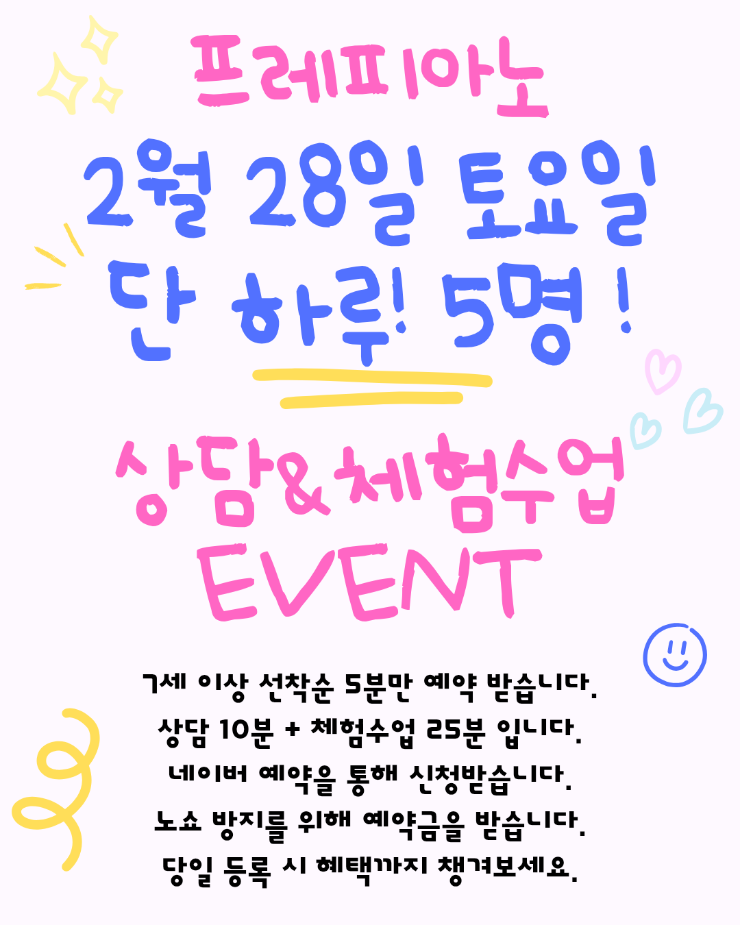 안녕하세요, 프레피아노입니다 새학기를 맞이하여 상담&체험수업 이벤트 진행합니다 ✔️피아노학원을 보내고 싶은데 어떤식으로 수업하는지 궁금하셨을 분들. ✔️선생님과 아이가 잘 맞으면 좋겠는데 걱정되셨을 분들. ✔️평소 프레피아노를 눈여겨 보고 궁금했는데 이번에 상담 받아볼까? 하시는 분들. 모두 주목해주세요 모든 궁금증을 한 번에 해결하실 수 있도록, 상담과 체험수업을 준비해보았습니다. 선착순으로 딱 5분만 예약 받습니다. 처음 피아노를 배우는 아이들을 비롯하여 배운 경험이 있어도 체험수업 가능합니다. 6세 수업은 현재 자리가 없어서 7세부터 가능합니다. 양해 부탁드립니다. 예약 방법 네이버....... <img src="https://blogthumb.pstatic.net/MjAyNjAyMDhfMjg1/MDAxNzcwNTU4NDg5ODIx.mrT0N3cBwTQ7gZazfqK3QJWLXRbfynhfYhuHGnpr6QYg._I4FuL4-0caGrPJfv8Vz6VIX1ceO4QafSsKr5IXq4Cwg.PNG/740%A3%DF2%BF%F9_28%C0%CF_%C5%E4%BF%E4%C0%CF%A3%DF20260208%A3%DF224801%A3%DF0000.png?type=s3" />