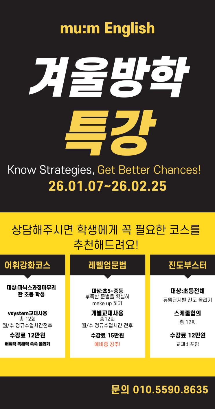 더 나은 겨울 방학을 위한 영어 학습 기회! 이번 겨울방학, 영어 실력을 확실히 향상시킬 수 있는 기회를 놓치지 마세요! 각 특강 수업은 학생들의 수준에 맞게 1:1 맞춤형으로 진행되므로, 효과적인 학습이 가능합니다. 더 자세한 사항은 광장동 뮤엠 영어학원(02-446-0579)으로 문의 바랍니다. <img src="https://blogthumb.pstatic.net/MjAyNTEyMDlfNzAg/MDAxNzY1MjUyMDU0NDA5.RicCngmTYkvOLAwd3d1pnA2iVxnCVZPx_fubDkqTIKAg.D93AkhBpAfyVOqi66oPGoFRqzcCe0ldDQ_aPVpf-OGMg.PNG/900%A3%DF1765207125728%A3%A81%A3%A9.png?type=s3" />