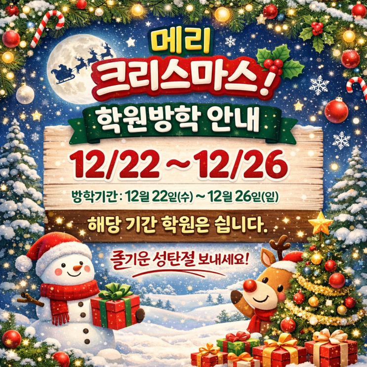 학원방학 안내 12/22~12/26 해당 기간 학원은 겨울방학을 갖습니다. 즐거운 성탄절 보내세요! <img src="https://blogthumb.pstatic.net/MjAyNTEyMTlfNjgg/MDAxNzY2MTI3MzYwNTU1.CLq1rXE4Ov8Xz0leQo0X5hvqN66_Or4_bBjouSn6btgg.UdjnbA9kM35Cq6ykujBnlw20lYjy402Wlq4oA7KzXRAg.PNG/KakaoTalk_20251219_155527739.png?type=s3" />