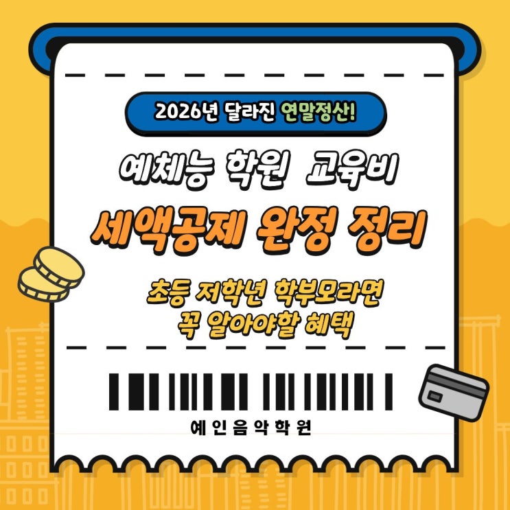 2026년부터 달라지는 교육비 세액공제 아이를 키우는 학부모님이라면 매달 고정적으로 나가는 학원비, 한 번쯤은 이런 생각 해보셨을 거에요. "이 많은 교육비, 연말정산에서 도움은 안 될까?" 피아노, 미술, 체육 같은 예체능 학원비 세액공제가 안 된다고 알고 계신 분들이 대부분이였죠. ✅2026년 핵심 변화 한 가지 초등 저학년 자녀의 예체능 학원비도 교육비 세액공제 대상에 포함됩니다. 즉, 아이의 성장을 위해 선택한 예체능 교육이 이제는 연말정산 혜택으로도 이어지게 된 거예요. 적용 대상은 누구일까요? ✔️대상 : • 초등학교 1~2학년 • 만 9세 미만 자녀 ✔️적용 시기: • 2026년 1월 1일 이후 지출한 학원....... <img src="https://blogthumb.pstatic.net/MjAyNjAxMjZfMzgg/MDAxNzY5NDMxNTM0NzA1.8vpeFdxCNd65GrWOe3D_JIglo_1OU3YrQ29UaVz0i8Ug.qdywgkTOBO0tKt6fpWHq-f3NJhayUp4pcgGZvwMQfiUg.JPEG/1.jpg?type=s3" />