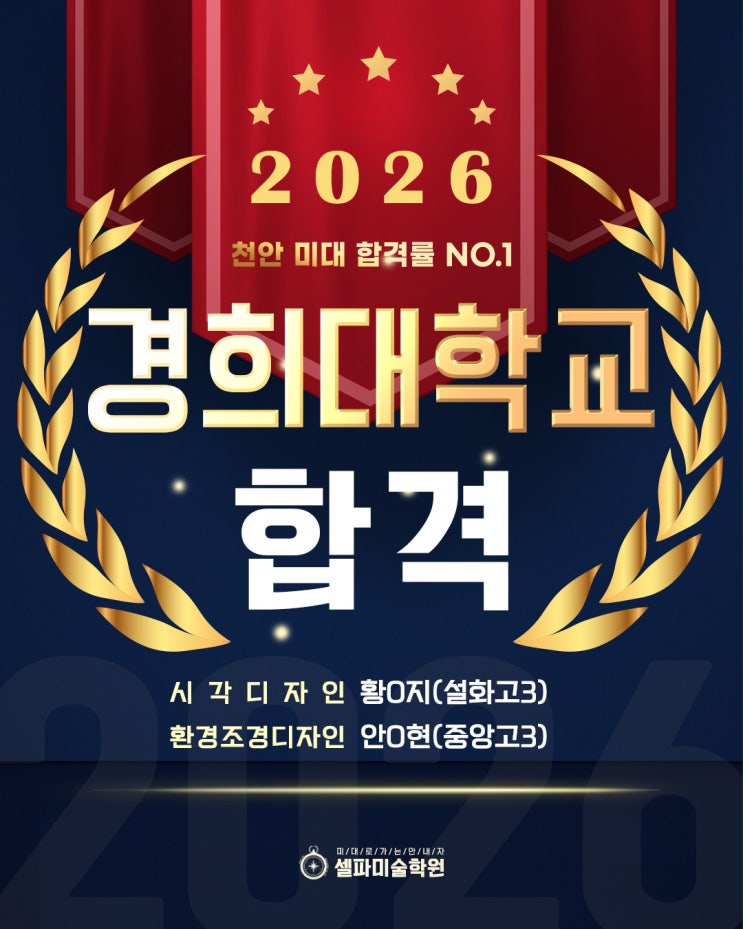 안녕하세요 천안 입시미술 전문 디자인 셀파미술학원입니다 : ) 올해도 열심히 달려온 셀파 친구들~ 모두 수고 많았어요. 경희대학교 시각디자인학과 &환경조경디자인학과 합격을 축하합니다!! 2026학년도 경희대 합격 결과 시각디자인학과 황O지(설화고3) 학생 환경조경디자인학과 안O현(중앙고3) 학생 합격을 축하합니다! . . . 천안에서 27년 동안 오직 학생들의 미대 진학과 그들의 꿈과 미래를 위한 교육을 하고 있습니다. ▼셀파 인스타그램▼ <img src="https://blogthumb.pstatic.net/MjAyNjAxMjZfNTIg/MDAxNzY5Mzk1MzU3NjY1.asLioijcTFfq_o6hQjMZ79un15jkIIj6IRGaiRFDzmcg.fLN2VFnwAAD05R1MWmnEp73_f8gdHkKxcIzppZXL-AEg.JPEG/%B0%E6%C8%F1%B4%EB%282%29.jpg?type=s3" />