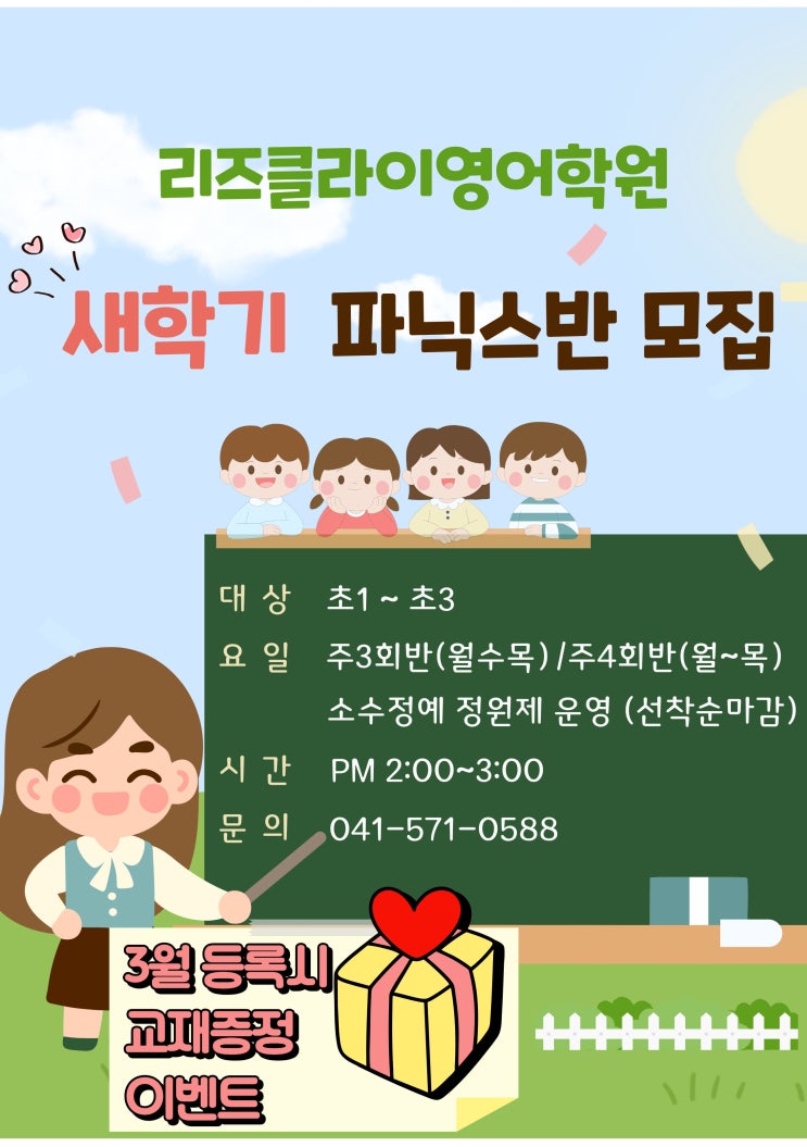 리즈클라이 영어학원 파닉스반 모집 안내 ✨ 영어의 시작, 파닉스부터 탄탄하게! 체계적인 커리큘럼과 꼼꼼한 지도로 아이들의 영어 자신감을 키워드립니다. 모집 대상 ✔ 초등 1학년 ~ 3학년 ✔ 영어를 처음 시작하는 학생 ✔ 읽기 기초를 탄탄히 다지고 싶은 학생 수업 내용 ✔ 알파벳 음가 완벽 이해 ✔ 파닉스 규칙 체계적 학습 ✔ 개인별 발음지도 및 교정 ✔ 단어 읽기 → 문장 읽기 확장 ⏰ 수업 시간 주3회반(월수목) 주4회반(월 ~ 목) 오후 2시 ~ 3시 ※ 소수정예 정원제 운영 (선착순 마감) 문의 및 상담 ☎ 041-571-0588 ✨ 영어의 첫 시작, 리즈클라이 영어학원과 함께하세요! 시작이 다르....... <img src="https://blogthumb.pstatic.net/MjAyNjAyMTlfMTgy/MDAxNzcxNDg3MTM2MjAy.g7cUshyfTHOXCPeoomob4RKyZLHK5HhOaoUeXgDUs_Ag.9PXl9EzgdreQ-JEJFjfmuLuZQfjcZDoKdkd2xqkoHu0g.JPEG/%C6%C4%B4%D0%BD%BA%B8%F0%C1%FD.jpg?type=s3" />