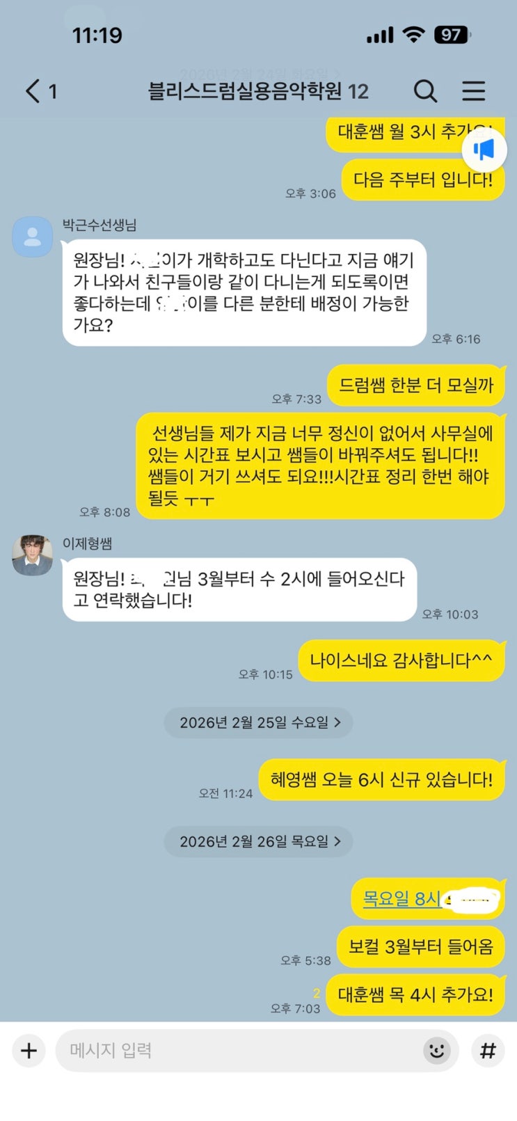 안녕하세요 천안드럼학원 블리스드럼 실용음악학원 입니다^^ 너무 오랜만에 들어왔네요 그간 학원이 너무 바빴어요ㅠㅡㅠ 넷플릭스보다 재밌는 학원 드럼 기타 누가누가 더 많이 들어오나 대결인가 싶을 정도로 엄청난 등록에 등록문의 폭발에 학원은 계속 풀방에 너무 바쁜 나날을 보내다가 드디어 오랜만에 블로그로 돌아왔습니다~~~!! 폭풍같은 방학이 끝나고 벌써부터 새학기 등록이 계속되고 있네요 드럼 기타파트는 자리가 거의 다 찼고 보컬도 두 타임 남아있습니다 고민은 시간만 늦출뿐 오고싶어도 자리가 없어서 등록못하는 드럼학원이라고 이미 소문이 자자하다능?! 대기도 많고 등록도 많아서 관심있으시면 고민....... <img src="https://blogthumb.pstatic.net/MjAyNjAyMjdfODMg/MDAxNzcyMTUxMzE5NzEw.-FYBz-DVNtCZybWrdKUeOVTo0jHiYD_eMz7aTTagTeYg.tTpuCiV8K7QzVLaZZmgymGgNnV6gHPUcBZCQxsQ-0Bsg.JPEG/IMG%A3%DF2617.jpg?type=s3" />