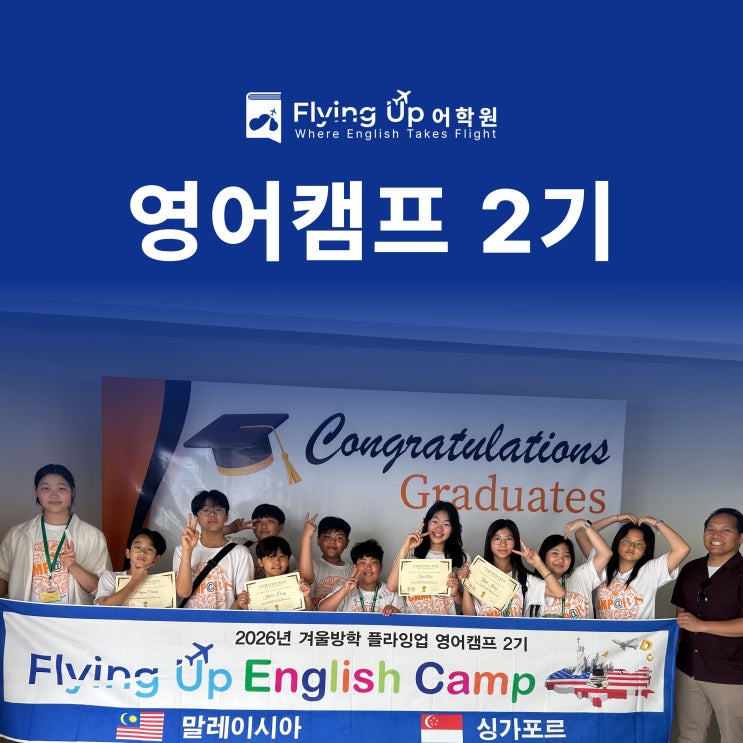 방학마다 진행되는 플라잉업어학원 글로벌 영어 캠프! 이번 2기 캠프는 싱가포르에 위치한 래플스 국제학교에서 진행됐어요. 영어 실력 향상을 넘어 다양한 경험으로 더욱 성장하여 돌아온 우리 아이들 그 이야기 지금 바로 시작합니다! OT 캠프 출발하기 전 원어민 영어 선생님과 함께 OT 수업을 먼저 진행했어요. 우리 학생들이 해외에서 자주 사용하게 될 필요한 문장들을 연습하고 발표해 보는 시간을 미리 가져보기도 했어요. OT 진행해 주신 원어민 선생님은 이번 싱가포르 캠프에 동행하여 해외에서도 아이들의 수업과 안전을 책임져 주셨어요! 공항 출국 플라잉업어학원 글로벌캠프는 영어 실력과 자신감 향상 그리고 더 나아가 아이들의....... <img src="https://blogthumb.pstatic.net/MjAyNjAyMjdfMTQz/MDAxNzcyMTk3MjU2ODQy.FhQcACWpTCHWV361Det2cIuuxQ9fZjhvAwVucazlW50g.IkflnxGdsGOvN22STReu2pR5-b4Awb8b1aT8Pu-4BZcg.JPEG/%B7%A1%C7%C3%BD%BA_%B1%B9%C1%A6%C7%D0%B1%B3_%C3%CA%B5%EE_%BD%CC%B0%A1%C6%F7%B8%A3_%BF%B5%BE%EE_%C4%B7%C7%C1_2%B1%E2_%C8%C4%B1%E2.jpg?type=s3" />