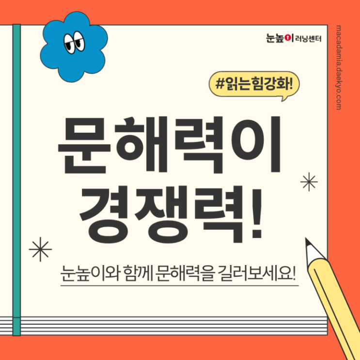 안녕하세요 대교 눈높이 남천안교육국 입니다 : ) 최근 들어 문해력의 중요성에 대해 강조하는 교육전문가들이 많아졌습니다. 왜 문해력이 중요할까요? 학부모님들과 상담을 하다 보면 이런 이야기를 자주 듣습니다. “우리 아이가 문제를 아예 모르는 건 아닌데 자꾸 틀려요.” “문제를 제대로 안 읽고 풀어요.” “책은 읽는데 내용을 설명을 못해요.” 이럴 때 가장 먼저 점검해봐야 하는 것이 바로 문해력입니다! 문해력이란 무엇일까요? 문해력은 단순히 글을 읽는 능력이 아닙니다. 글의 의미를 이해하고, 해석하고, 활용하는 힘을 말합니다. ✔ 문제를 정확하게 읽는 힘 ✔ 지문 속 핵심을 찾는 힘 ✔ 글의 내용을 스스로 정리하는 힘 이....... <img src="https://blogthumb.pstatic.net/MjAyNjAzMTFfMzkg/MDAxNzczMTkxMzgyMTcw.NPNQ4nEGhugmWj8_gCR5bYQmQ8PC3XxtB-bJOjrqY2Ag.KqgsehNdZLsnC6_aPB3F9Z_7URQbAUwTWV1xyJ90TFYg.PNG/1_%B9%AE%C7%D8%B7%C2_LC.png?type=s3" />