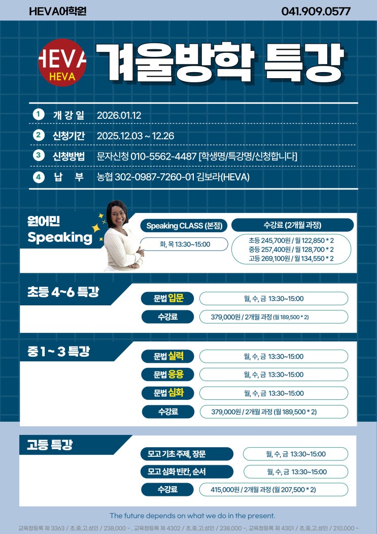 우리 아이의 언어 능력을 향상시키는 특별한 방법, HEVA 어학원의 겨울특강 프로그램 원어민 선생님의 Speaking Class도 준비되어있습니다^^ 천안 예비중, 예비고 학생들도 모두 함께 할 수 있는 겨울방학 특강! HEVA 어학원의 겨울특강 프로그램은 우리 아이들의 언어 능력을 향상시키는 특별한 기회를 제공합니다. 지금 바로 접수하고, 새로운 도전을 시작해보세요! <img src="https://blogthumb.pstatic.net/MjAyNTEyMDNfNzgg/MDAxNzY0NzM5MTM4ODI0.ETR001tQraLOxv3AxhqXIHVnFMmXtiAp3zFgGZknb3Mg.BKgMQTIoePe9GT2IT-oExNNuWZOGgZM-UR_2HcEY_tQg.JPEG/001.jpg?type=s3" />