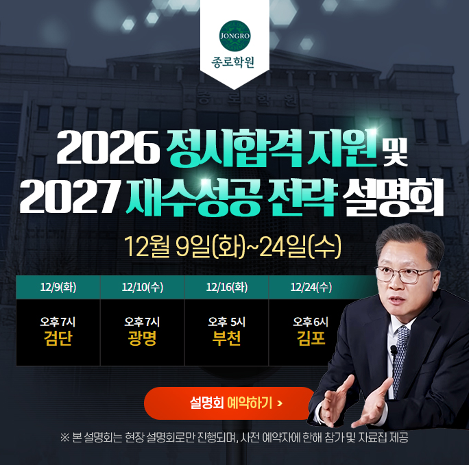 [종로학원] 광명, 부천, 시흥, 인천, 김포 2026정시 지원전략 설명회 개최