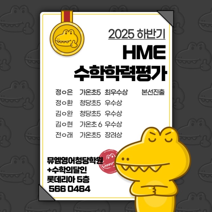 우리 아이들이 이번 HME 수학 학력 평가 시험을 준비하며 보여준 노력과 성장의 과정은 그 어떤 결과보다 값지고 의미 있는 여정이었습니다. 단순히 시험 한 번을 치른 것이 아니라, 그 시험을 위해 수주 동안 꾸준히 시간을 투자하고, 스스로의 약점을 찾아 보완하며, 어려운 문제 앞에서도 포기하지 않고 끝까지 도전하는 모습을 가까이에서 지켜보며 정말 많은 감동을 받았습니다. 특히 이번 평가에서 본선 진출이라는 성과를 이루어낸 것만으로도 충분히 대단한 일이지만, 그에 더해 우수상이라는 뛰어난 결과까지 얻어낸 것은 우리 아이들의 잠재력과 가능성이 얼마나 큰지 보여주는 멋진 증거였습니다. 본선 무대에 오르기까지 결코 쉽지 않....... <img src="https://blogthumb.pstatic.net/MjAyNTEyMDZfOTkg/MDAxNzY0OTkzMTMzMDI1.ung99vB0Kra8llAM-TEcTQ6ywkgh4VRIYxjHPX0zIgUg.MuVsIvNK0VpSFNHVCqSqCu2Z4yKIRp7PbX2tsXm3Rx4g.JPEG/900%A3%DF1764992725374.jpg?type=s3" />