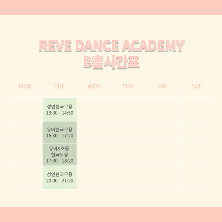 ✨ 한국무용 신규반 모집 안내 ✨ 예쁜 마음과 곧은 자세를 함께 배우는 시간, 우리 전통의 아름다움을 몸으로 표현해보세요 움직임 속에서 자세와 체형이 교정되고, 집중력까지 함께 이뤄집니다. 유아부터 성인까지 기초부터 창작무용까지 단계별 수업 DM으로 문의 주세요 ▫️발레 / 현대무용 / 한국무용 입시전문 ▫️1:1 개인별 맞춤 교육 ▫️ 원장•부원장 직강 및 우수한 강사진 ▫️ 철저한 학습관리 프로그램 ⚜️REVE BALLET ACADEMY⚜️ 상담문의 tel. 010.2349.7973 (방문상담시 시간예약 필수!) ▪️소수정예 수업(수업별 10명 정원) ▪️한양대학교 출신 원장•부원장 선생님 ▪️다수자격증 및 현역....... <img src="https://blogthumb.pstatic.net/MjAyNTEyMDJfMjYy/MDAxNzY0NjU4NzIyNjQ4.4wlEx8VFDoustnYhSObf2Utbv7hQ_Q2ml-XP6LfJi18g.fRk0dURc0m7dMbgHQ4EMxeBwKf0bTRlKdDku6zqnKyQg.PNG/IMG%A3%DF6134.PNG?type=s3" />