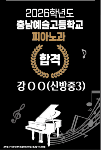2026학년도 [충남예술고등학교 피아노과] 합격을 축하합니다. 우리둥이와 2017년에 초등학생 1학년으로 만나~~ 어느덧 9년을 함께 했습니다. 그저 피아노가 좋아서~~ ^^ 중학생이 되면서 "공부는 몇시간 하라하면 못하겠는데 피아노는 몇시간이고 칠 수 있을것같아요." 이 말에 "그럼 전공해보자~" 피아노는 재능도 있어야하겠지만 좋아야지 할 수 있는것 같습니다. 재능이 있다고 꾸준함이 없다면 빛을 낼 수 없습니다. 꾸준함은 그것을 할 때 즐거움이 힘이되어 끌어 갈 수 있습니다. ' 꾸준함~~~ ' 충남예고에서의 3년이라는 시간속에 성장 해 나갈 우리둥의 모습이 기대됩니다. 너의 성장하는 과정을 선생님이....... <img src="https://blogthumb.pstatic.net/MjAyNTEyMDdfMTc3/MDAxNzY1MDM4MTE5MzYz.PgHgZRoCSrq45xbu1K1UTUsfGB14xg8RbDyXFbXwAPkg.mLYUugvToptgAEkBcBVqB7cryxNQvyn4Lg3rLCRh4NMg.PNG/temp%A3%DF1762930022357.447355471%A3%DF3229947182303073.png?type=s3" />