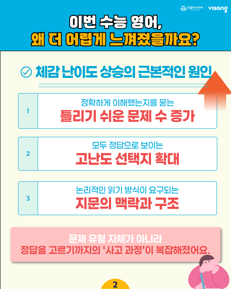 올해 수능에서 영어는 절대평가임에도 불구하고 체감 난이도가 매우 높았습니다. 특히 1등급 비율이 3.11%에 그치며, 상위 4% 이내가 1등급인 상대평가 과목과 비교해도 낮은 수준이었습니다. 이에 따라 수능 최저 등급을 맞추는 데 영어가 결정적인 역할을 할 것이라는 예측이 나오고 있습니다. 이번 수능 영어, 왜 더 어렵게 느껴졌을까요? 1. 정확히 이해하지 않으면 틀리기 쉬운 문제가 늘어났어요. 지문의 중심 논지를 끝까지 유지하지 못하거나, 문장 간의 논리적 연결을 하나라도 놓치면 오답을 고르게 되는 문제들이 많았습니다. 2. 선택지가 모두 그럴듯해, 판단이 더 어려웠어요. 빈칸 추론, 글의 순서, 문장 삽입 등 문제의 유형 자체....... <img src="https://blogthumb.pstatic.net/MjAyNjAyMDhfMjA3/MDAxNzcwNTQ4NDAzMjI3.n-ks34WgXLAQyMtxn58lSsL-oPkf0TKpVmYgJd_XOokg.yt-SwlTgbd3942wntj_m9bU0EgsGhHOIGq75DFWOhiEg.PNG/1%BF%F9_%B1%B3%C0%B0%B4%BA%BD%BA_3.png?type=s3" />
