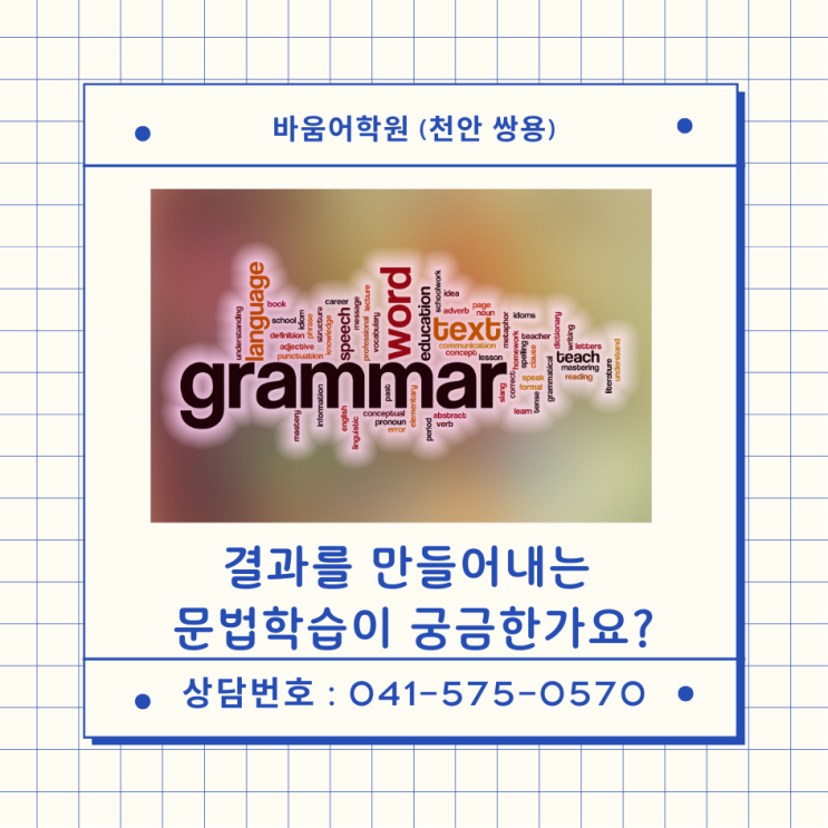 안녕하세요 개별 맞춤형 학습으로 결과를 만들어 내는 천안 쌍용동 바움어학원입니다! 최근 들어서 영어 문법의 중요성이 서술형 평가 확대와 함께 점점 커지고 있습니다. 중고등학교 내신 영어시험에서 문법이 약한 학생들은 이제 제대로 상위권 성적을 낼 수가 없는 것이 현실입니다. 아직도 여전히 문법이 어려운 학생들을 위해서 바움어학원은 개인별 맞춤형 문법 수업을 통해서 확실한 결과를 만들어내고 있습니다. 하브루타 학습법으로 깊이 있는 문법 이해를 완성합니다! 바움어학원의 문법 수업은 단순한 규칙 암기를 넘어섭니다. 학생들이 수동적으로 교사의 설명을 듣기만 하는 전통적인 방식에서 벗어나, 능동적으로 참여하고 스스로....... <img src="https://blogthumb.pstatic.net/MjAyNTExMjRfMyAg/MDAxNzYzOTQ1MDg4MTE5.0vH053SubqOfrlFBLipmz9oBhxOe5GnnZ2Hz6JK6D88g.uaQUslNS1uV_Qz38yhlc8DelXR43wRYwb6ZcK3-6F7Yg.PNG/%B9%D9%BF%F2%BE%EE%C7%D0%BF%F8_%281%29.png?type=s3" />