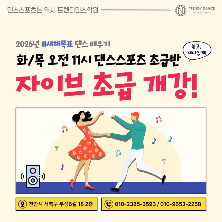 2026년 새해 목표!! 건강한 몸 만들기 건강한 몸을 만들 때 하면 좋은 운동이 어디 없을까? 할 때는 바로 여기!! 트렌디 댄스학원의 댄스스포츠 새해를 맞이하여 트렌디 댄스학원에서 댄스스포츠 초급반 신규 개강 합니다! <댄스스포츠 자이브 초급반> ▶매주 화/목 오전 11:00-11:50◀ (2026년 1월 6일 화요일 개강) 프로 라틴 강사진이 직접 강의하는 트렌디 댄스학원 댄스스포츠 수업 ✨ 초보자도 부담 없는 수업 분위기로 쉽고 재미있게 댄스를 배우고 즐길 수 있습니다! 자이브는 댄스스포츠 중에서 가장 신나는 종목으로 그만큼 다이어트에도 정말 효과적인데요 새해 목표! 건강한 몸 만들기에 아주 탁월한 운동 댄스스포츠 자이브! ....... <img src="https://blogthumb.pstatic.net/MjAyNTEyMDZfMjE2/MDAxNzY0OTk3MjA3NzIw.T0KAvdlohENmkO5ZIDdpXGADAy8TOYtW8QcIM4Ihvq8g.UXJcgGVG78dVy0iDrBmvhR6Xzbu84RnbhjgDEimSMAcg.PNG/2026_1%BF%F9_%C0%DA%C0%CC%BA%EA_%B0%B3%B0%AD.png?type=s3" />
