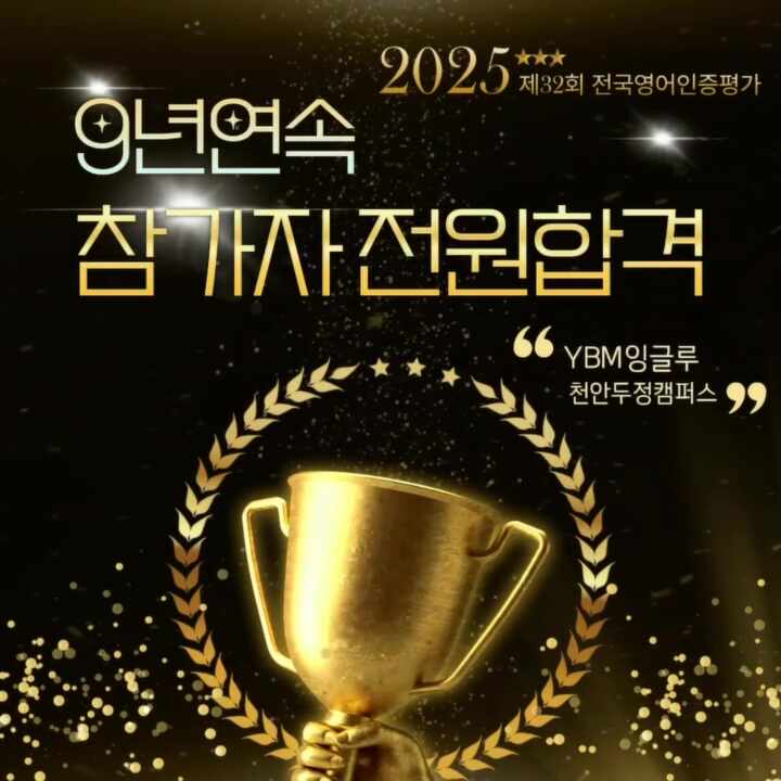 갑자기 기온이 뚝 떨어지고 일교차도 커지면서 독감 환자가 부쩍 늘고 있어요. 우리 친구들과 학부모님들 모두 건강관리 잘 하셔서, 따뜻하고 건강한 겨울 보내시길 바랄게요. 오늘은 두정동 영어학원 YBM잉글루에서 정말 기쁜 소식을 전해드려요. 바로 전국영어 인증평가에서 올해도 전원 합격! 무려 9년 연속 전원 합격이라는, 쉽게 만들어지지 않는 기록을 다시 이어갔습니다. 시험 당일, 아이들이 조금은 긴장된 얼굴로 들어오면서도 그동안 쌓아온 실력으로 스스로를 믿고 문제를 풀어나가는 모습이 정말 멋졌어요. 시험이 끝난 뒤 안도의 미소를 짓던 순간까지, 한 명 한 명 모두 자랑스러웠습니다. 이번 결과는 단순히 시험을 잘 봤다는 의....... <img src="https://phinf.pstatic.net/image.nmv/blog_2025_11_21_1656/0EVxFYEhxE_04.jpg?type=f480x480" />