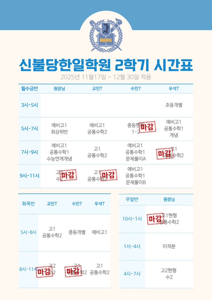최근 많은 문의 감사합니다! 현재 정원 마감된 반 안내드립니다 안녕하세요. 신불당한일학원입니다~! 최근 수업 관련하여 많은 학부모님들과 학생들께서 꾸준히 문의를 주고 계십니다. 관심 가져주신 모든 분들께 진심으로 감사드립니다^^ 저희 학원은 학년 • 수준별 수소정예 수업을 원칙으로 운영하고 있으며, 한 반은 절대 8명을 넘기지 않는 정원 제한을 지키고 있습니다. ✔️ 학생 한 명 한 명의 학습 흐름을 놓치지 않고, ✔️ 성적 향상을 위한 밀착 관리와 꼼꼼한 피드백을 제공 하기 위한 운영 방식입니다. 이러한 이유로 최근 문의 증가와 함께 일부 반이 정원 마감 되어 현재 수강이 어려운 반을 아래와 같이 안내드립니다. ?....... <img src="https://blogthumb.pstatic.net/MjAyNTExMjRfOSAg/MDAxNzYzOTg0MDk3MTIx.LHFZ3Em-Kvzm__AAFHcdV3FZ1MKIV2CuXD9uNsajgQUg.NcDFVyekuUfp__1tSw6zmeTcDX1PLRAaRiHtmK8Fq0gg.JPEG/KakaoTalk_20251121_181821875.jpg?type=s3" />