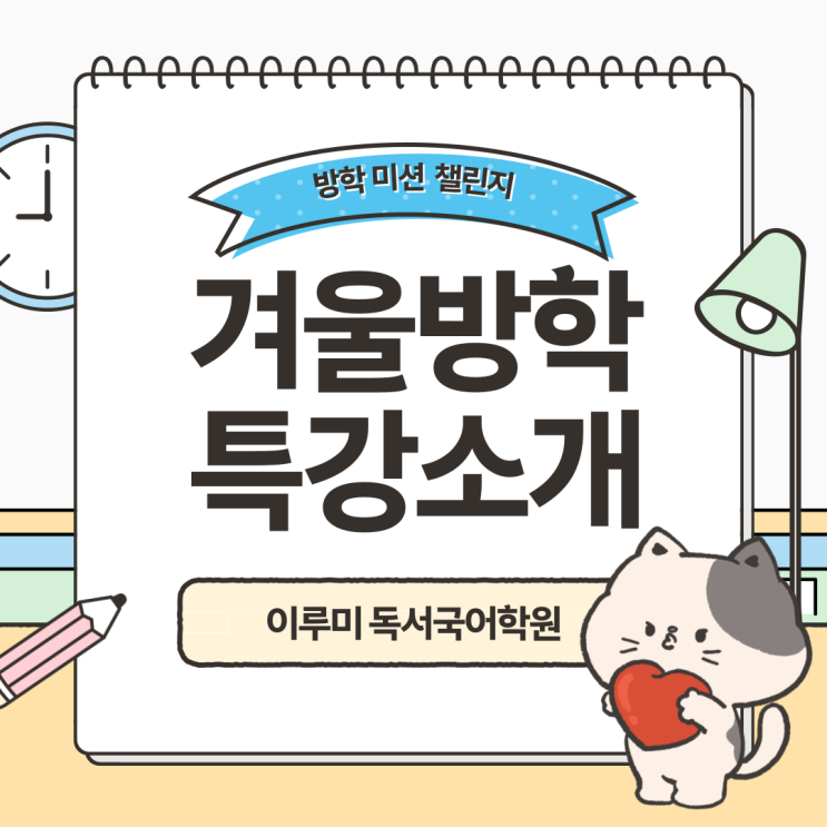 안녕하세요 이루미독서국어 학원 루미샘 입니다:) 날씨가 많이 추워지며 이제 우리 아이들의 겨울 방학이 다가오고 있는데요. 올해도 이루미 독서국어학원에서는 특별한 겨울 방학 특강을 준비했습니다. 겨울 방학 특강 첫번째는 바로 매일 읽고 매일 쓰는 몰입독서반 입니다. 2206년 1월 9일부터 2월 28일 까지 운영되며 운영시간은 오후 12시 30분부터 오후 6시 30분까지 운영됩니다. 자신의 레벨에 맞는 도서를 문학, 인문, 사회, 과학, 예술의 장르별로 골고루 읽어내 편독을 예방하며 제대로 읽고 잘 읽었는지에 대한 이해도를 확인 후 다양한 종류의 글을 쓰는 활동이 집중적으로 진행되는 몰입독서 겨울방학 특강 입니다. 겨울방학 특강 두....... <img src="https://blogthumb.pstatic.net/MjAyNTExMjlfNzUg/MDAxNzY0NDIxMzc0NzEy.I6WhMr-aK7ooVV52rmwyn3V0NzhD9WgSK59wpb6hcOwg.21hjKxOI0xdX0en4J62DB36fZJugZSGK4CuJq2tz93sg.PNG/001.png?type=s3" />