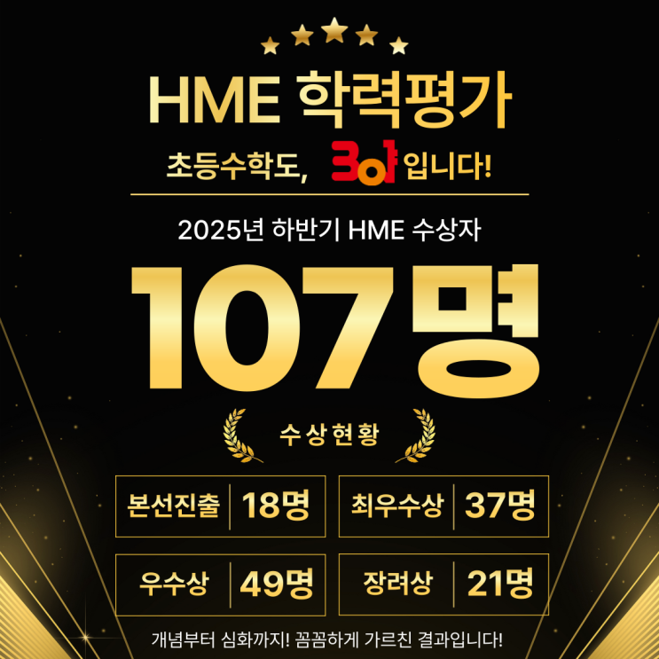 안녕하세요. 천안 아산 수학과학학원 301영재수학과학학원입니다. 어느덧 25년도 이제 한 달 밖에 남질 않았네요. 25년 초에 계획했던 일들이 모두 이루어졌는지 모르겠습니다. 혹시 생각과는 다르게 흘러갔더라도 괜찮습니다. 내년에도 기회는 있으니까요! 코로나 이후 아주 오랜만에 초등 아이들 HME 학력평가를 실시했습니다. 그 결과, 전원 입상이라는 아주 좋은 결과를 낳았습니다. HME 학력평가는 전국 단위로 시행하는 검증된 평가입니다. 개념이 잘 잡히지 않고 단순한 연산만 한다면 아마 입상하기는 어렵겠죠. 301은 기본 개념을 교구를 사용하여 수업하고, 유형을 배우고 심화를 꼼꼼하게 식을 써가며 공부합니다. 이번에 갑자기 결정....... <img src="https://blogthumb.pstatic.net/MjAyNTEyMDFfMzAw/MDAxNzY0NTg1ODQ4NDA0.5LyqRHwynIiCkC61atgjKcbyeq2DFVrbjegc7WwA46kg.jVqPRKO75o4itVllXgnvLHgwQ_iUCslen7hPXtbwKkgg.PNG/HME%B0%E1%B0%FA.png?type=s3" />