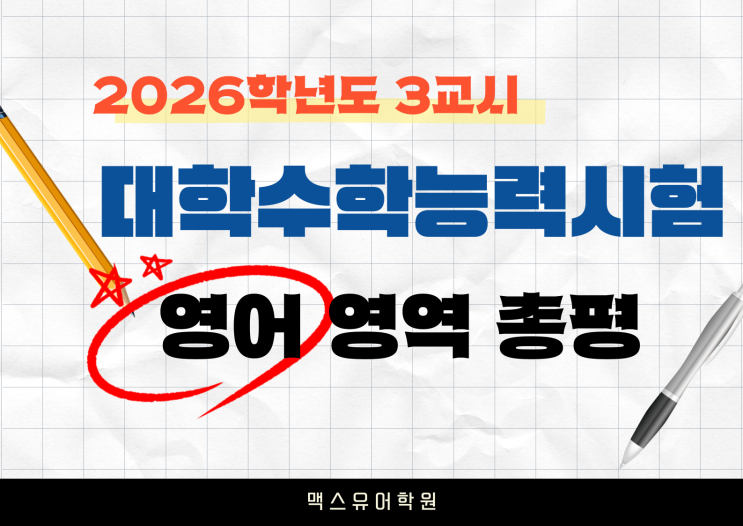 안녕하세요, 입시 영어의 확실한 선택! 맥스유어학원입니다. 2026학년도 수능 영어는 최근 몇 년 수능 중에서도 가장 어렵다는 평가가 나올 만큼, 난도와 오답률이 동시에 높게 나타난 시험이었습니다. 특히 빈칸, 제목, 순서, 삽입, 요약문 등 고난도 유형의 체감 난도가 크게 뛰었기 때문에, 평소 영어를 안정적으로 풀던 학생들조차 시간 압박을 경험했을 가능성이 큽니다. 오늘 분석에서는 중복 요소를 완전히 제거한 시험 핵심과 그리고 2027 수능 영어 대비 전략까지 한 번에 정리해드립니다! 전체 난도 총평 절대평가 이후 최상 난이도 1등급급 비율은 3.11% 역대급 하락! 이번 시험의 가장 큰 특징은 지문 자체의 난도가 높아졌다는 점입....... <img src="https://blogthumb.pstatic.net/MjAyNTEyMDZfMjA2/MDAxNzY0OTk4MjUxMTU0.yLF3ZzULtKmiraG7hybMydidW1cK07ct56lMwA79ajwg.NvT-T7rV8XpqXTwb_sGLyH-aYcqadYLWst-eoCLhGZ8g.PNG/%C1%A6%B8%F1%C0%BB-%C0%D4%B7%C2%C7%D8%C1%D6%BC%BC%BF%E4_-001_%284%29.png?type=s3" />
