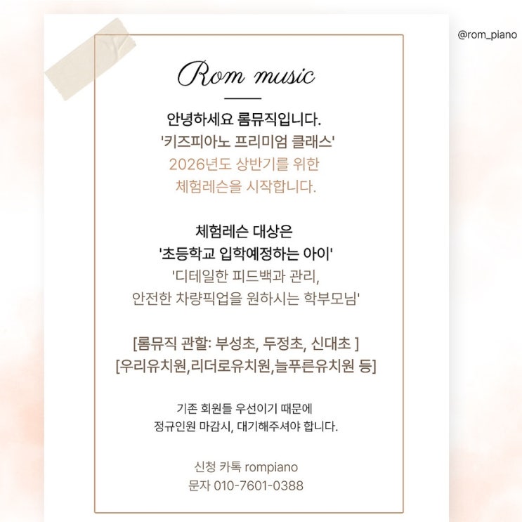 두 2026년도 체험레슨을 시작합니다 체험 레슨 대상은 초등학교 입학예정하는 아이 디테일한 피드백과 관리 안전한 차량픽업을 원하시는 학부모 2026년도 내 아이의 두정동, 차량운행+프리미엄 음악학원을 찾으시나요? 롬뮤직은 키즈클래스를 프리미엄 정원제로 운영하며 섬세한 커리큘럼과 피드백으로 아이들을 관리하고 있습니다 차량운행 관할 초등학교: 부성초 신대초 두정초 유치원: 우리유치원 늘푸른유치원 리더로유치원 도솔유치원 두정동 관할 입니다. 안전과 탄탄한 음악교육을 지향하는 롬뮤직에서 체계적인 음악교육과 피아노연주 시작하도록 내아이에게 선물해주세요 문의: 01076010388 카톡:rompiano #두....... <img src="https://blogthumb.pstatic.net/MjAyNTEyMDhfMTY4/MDAxNzY1MTk4MTE0MjYw.qwszBlSwVcZptv4S274-boltIXl35NPB-E-_aQ8vzEAg.iycvHvLJfhy6yfeFlAkCupxP90MfShhbUaMjkESeEg4g.JPEG/75DF84DC%A3%ADF12E%A3%AD4428%A3%ADA2C8%A3%AD5672774A315D.jpg?type=s3" />