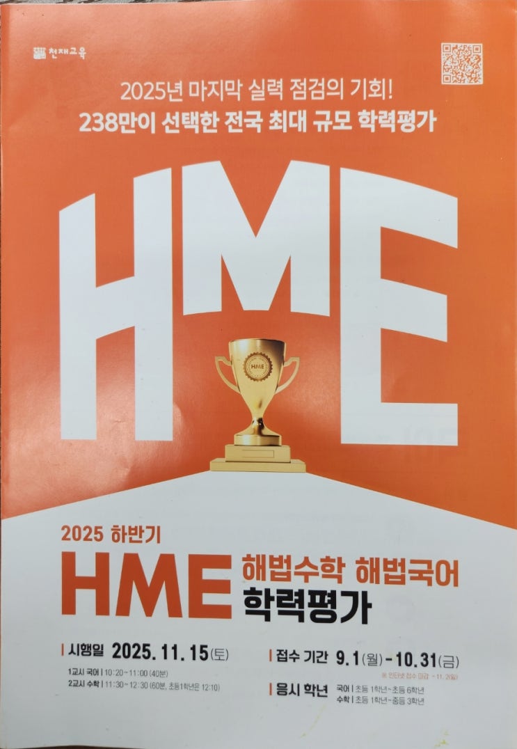 2025하반기 HME는 혜택이 하나더 추가됐어요!!^^ 국어 독해력문제 체험 그래서 참가자도 많았어요! 진지하게 집중해서 문제푸는 아이들^^귀엽죠! 이번에는 자기진단평가(아이큐검사,진로 적성검사)를 받기위해 HME를 보는학생도 있었어요) 짜잔 결과는 전원입상!!! 상위5프로 안에 든 제자가 2명이나있었고 덕분에 저까지 지도교사상!!!(감격스런 순간!!) 진정한 전원입상!!!♡ 시험대비는 따로 하지는 않았고 최근 3개년 기출 풀고 오답정도하고 평소 실력대로 봤습니다!!^^ 이 자신감을 갖고 다가오는겨울방학엔 좀더 깊이있는 공부로 한번더 도약하는 계기로 삼으려합니다!!^^ 우리 불당 SM 스마트해법수학 불당아이파크점 겨울방학까지 쭈~~~....... <img src="https://blogthumb.pstatic.net/MjAyNTEyMDFfMjk0/MDAxNzY0NTkxMTQ4NTE5.t4V7Yd81g_nEpZslaRI2BmY-kT66iDYpbVzyIQI4VC8g.0rEge9XMvY8-vf5B565Sc-hoo4_yk46FIr8tfc7_rZ0g.JPEG/900%A3%DF20251201%A3%DF210820.jpg?type=s3" />