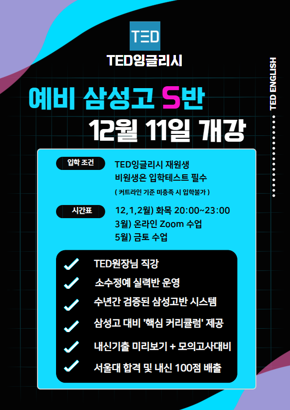 안녕하세요~! TED잉글리시입니다~!! TED잉글리시 예비 삼성고 S반이 드디어 12월 11일 개강합니다! 그동안 수많은 합격생을 배출해온 TED잉글리시의 핵심 프로그램으로, 삼성고 준비를 체계적으로 시작하고 싶은 학생들에게 최적화된 반입니다. 입학 조건 TED잉글리시 재원생은 바로 수강 가능 신규 학생은 입학 테스트 필수 (커트라인 기준 미충족 시 입학 불가) 원장님과의 1:1 상담으로, 학생 개개인의 학습 수준을 정확히 파악한 뒤 배정하기 때문에, 소수정예로 더욱 집중도 높은 수업이 진행됩니다. S반만의 특별한 특징 ✔ TED 원장님 직강 ✔ 오랫동안 검증된 삼성고 반 시스템 ✔ 삼성고 대비에 특화된 ‘핵심 커리큘럼’ 제....... <img src="https://blogthumb.pstatic.net/MjAyNTEyMDNfMjk1/MDAxNzY0NzQ0OTY1NDg3.vrE01FoBCLXpwWs8_nvwZJ1WL8Sk08qBnMzwdhuDl3sg.P_VLVVyMt_-K2ahbGGpBctcCgCL5Zl__GAEpRrEMJiEg.PNG/%BA%B9%BB%E7%BA%BB_%BB%EF%BC%BA%B0%ED_1%C7%D0%B3%E2_%B8%F0%C1%FD_%BE%C8%B3%BB.png?type=s3" />