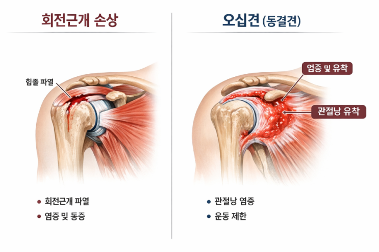 어깨통증으로 일상생활이 많이 불편하신 분들을 주변에서 종종 만날 수 있다. 여자분들 보다는 대게 50대 이상인 남자분들이다. 일상생활 불편뿐아니라 심한 통증으로 심각하게 수술까지 고려하시는 분도 계시다. 병원에서 한분은 오십견이라하고, 다른 한분은 회전근개 파열이라고 하는데 둘의 차이점이 뭘까? 많이 헷갈리는 회전근개 질환과 오십견을 어떻게 구분할 수 있는지 쳇gpt에게 물었다. 회전근개 질환(파열/염증) 회전근개란 어깨를 감싸는 4개의 근육과 힘줄을 말해요.(극상근,극하근, 소원근, 견갑하근) ✅️원인 반복사용. (운동, 집안일, 무거운 물건 들기) 퇴행성 변화. 외상. ✅️통증 특징- 특정 각도에서 통증(특히 팔을 옆으....... <img src="https://blogthumb.pstatic.net/MjAyNjAyMjdfMzAg/MDAxNzcyMTU3Njg0NzAy.V1RtXwTXiVOmGz-IWm7kkhPvEe6ZcXo2Nxkgt9b1wegg.mhsZL0SPDNUrIQf-8UbggUkKNLwcinWA-0m2bK6T9iog.PNG/900%A3%DFfile%A3%DF0000000032187208b189c2c379f0a457.png?type=s3" />