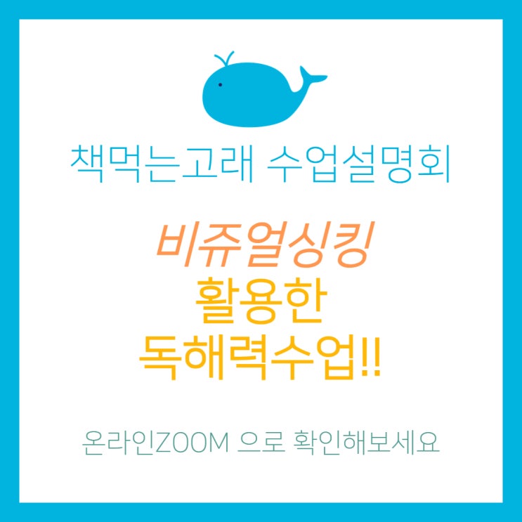 [비쥬얼싱킹을 활용한 독해력수업] 책먹는고래 수업 설명회를 합니다. 고등학교 내신에서 중요한 역량과 수행평가대비를 위해 미리 부터 해야할 것들이 어떤것이 있을까요 ? 선행은 어느정도 해야 할까요 ? 암기과목 점수는 왜 안나올까요 ? 사회도 공부해야 하나요 ? ️ 2025년 12월 19일 금요일 저녁 8시(20시) ️ 2025년 12월 21일 일요일 저녁 8시(20시) 중에 (택1 온라인ZOOM) 아래 링크로 설명회 신청 하시면 줌 링크를 드리도록 하겠습니다. https://forms.gle/ntrQPdScCAcRn1356 <img src="https://blogthumb.pstatic.net/MjAyNTEyMDVfMjYg/MDAxNzY0OTA1ODUzNDcw.StKYwIkkUXWQrHyb7InrjXdNTFzciUgifIGl9NJU7LEg.tQBkTf5slp69oOX3Xnb_n-ySYKA-8aLCNy2kwTnzWsog.JPEG/%B0%ED%B7%A1%BD%BA%C5%CD%B5%F0%BA%ED%B7%CE%B1%D7%BF%EB.jpg?type=s3" />
