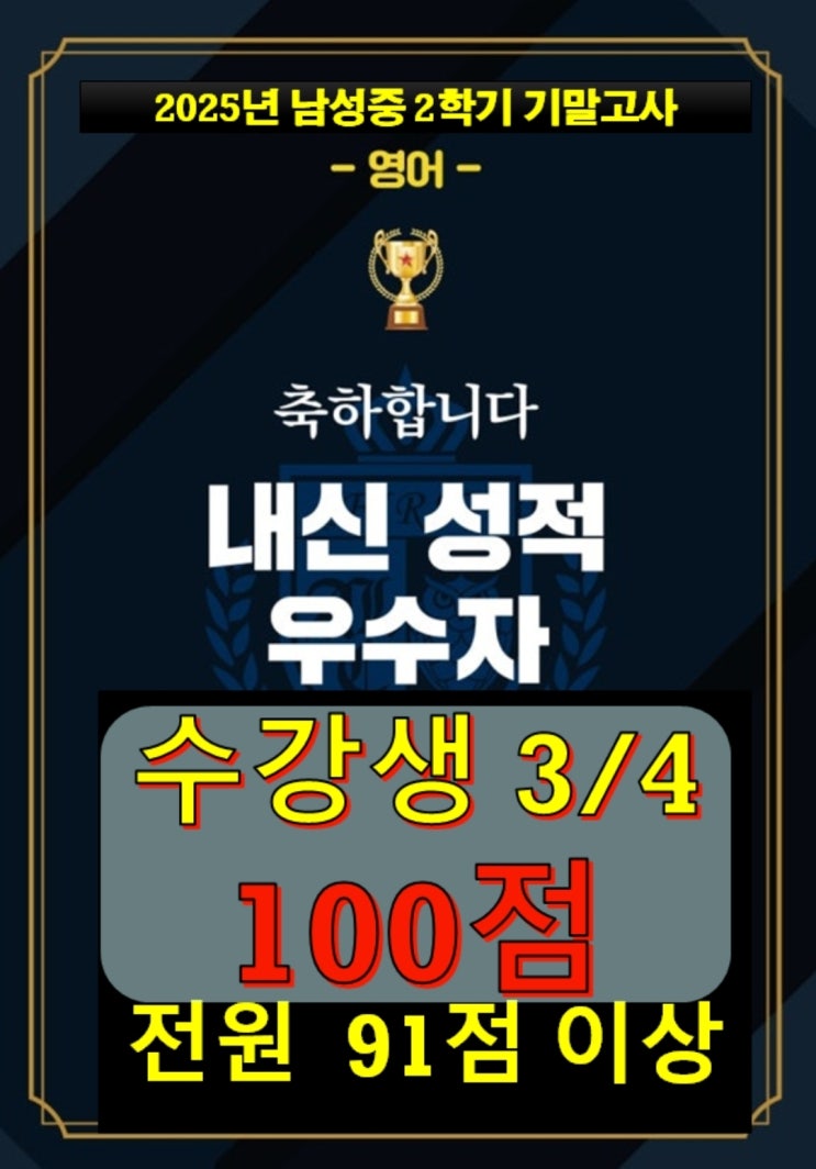 남성중 1학년 수강생 3/4 100점,전원 91점 이상 2025년 2학기 기말고사 내신 영어 사당동 남성역 영어학원 지앤비 사당캠퍼스
