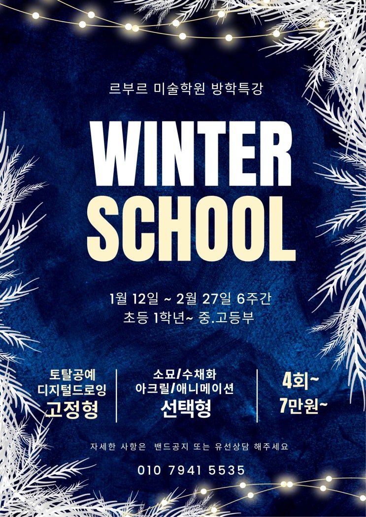 ❄️ 2025 WINTER SCHOOL 초등 겨울방학, 아이의 정서·창의력·집중력을 가장 크게 키워주는 시간 겨울방학이 다가올 때 많은 7~12세 학부모님들은 이런 고민을 하세요. “겨울방학 동안 아이가 시간을 의미 있게 보냈으면 좋겠어요.” “학습 스트레스는 줄이고, 창의력·집중력은 올릴 수 있는 프로그램 없을까?” “초등 시기 정서 안정이 정말 중요하다던데… 어떻게 도와줘야 하지?” 르부르 미술학원의 WINTER SCHOOL은 초등 겨울방학을 ‘성장 시기’로 만들기 위해 기획된 정서 기반 창의력 교육 프로그램입니다. 단순한 그림 수업이 아니라, 아이의 마음과 사고가 깊어지는 Winter 집중 과정이에요. 초등 시기 ‘정서적 기반’이 중....... <img src="https://blogthumb.pstatic.net/MjAyNTEyMDRfODgg/MDAxNzY0ODIzOTIyNjk0.vsL8phq5CMltGXerdMEsFrhzfGS7rtlnsF0SKSTcqHcg.4aJL4onZ6WFiHZJtPssDvSoIvQltNF01K0BYVWUdulcg.JPEG/Blue_Winter_Party_Club_Poster.jpg?type=s3" />