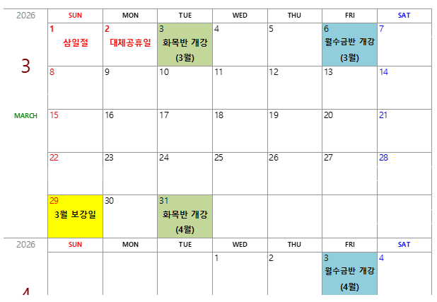 안녕하십니까. 데카르트수학국어학원입니다. 2026년 3월 수학수업 수강기간 안내 드리오니 확인하시고 원생 학습 시 참고하시기 바랍니다. [3월 학습 일정 공지] - 3월 등록기간 : 2/23(월) ~ 2/27(금) - 3월 수강기간 : 3/3(수) ~ 4/2(목) ○ 월수금반 개강일 : 3/6 (12회/월) ○ 화목반 개강일 : 3/3 (8회/월) - 3월 보강일 : 3/29(일) - 3월 휴원 : 3/2(월) - 대체공휴일 ※ 수강료는 선불이며, 교습 개시 이전에 납부 부탁드립니다. 감사합니다. #데카르트독서수학 #데카르트독서수학학원 #신불당수학학원 #신불당쎈수학러닝센터 <img src="https://blogthumb.pstatic.net/MjAyNjAyMjFfMjM4/MDAxNzcxNjY3NzM0MDUy.JwMhuZv2YY4Hf_VlSLup2GMYCAG5ywr15MttaoXQobcg.PcjPyGTRbrR48jyVLjfsOFTGf1MZIJeVLquFk3nvJ2Yg.PNG/image.png?type=s3" />