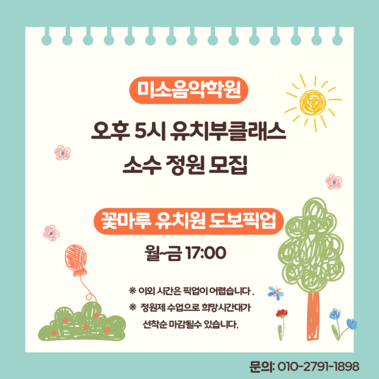 안녕하세요 전 연령 음악공간, 미소음악학원입니다. 오후 5시 유치부 클래스 소수 정원 모집 안내 초등 입학으로 시간대 조정이 이루어지며 5시 타임에 추가 등록이 가능합니다. 꽃마루유치원 도보 픽업 안내 ✔️ 월~금 오후 5시 수업 ✔️ 오후 4시 50분 원장 직접 인계 ✔️ 안전하게 도보 이동 후 수업 시작 차량 운행은 하지 않으며, 꽃마루유치원은 도보 픽업으로 진행하고 있습니다. ※ 정원제 수업으로 희망 시간대가 마감될 수 있습니다. 문의는 문자 또는 카톡으로 부탁드립니다 감사합니다 정원제로 완성하는 즐겁고 체계적인 음악 교육, 미소음악학원! 우리 아이의 첫 음악교육, 정직한 시스템으....... <img src="https://blogthumb.pstatic.net/MjAyNjAyMjNfMjM3/MDAxNzcxNzc2NzM0ODcz.OatC8xxFjDe177iRCgd0OXhpjYR43SjYgOAtXbRlEKUg.ogDWzaBgIopug-sqydeg0LRyA38cnHAykYpvPri7cgUg.PNG/900%A3%DF%B9%CC%BC%D2%C0%BD%BE%C7%C7%D0%BF%F8%A3%DF20260223%A3%DF010305%A3%DF0000.png?type=s3" />