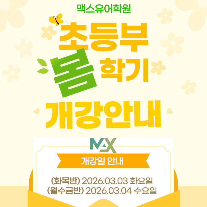 안녕하세요:) 입시 영어의 확실한 선택! 불당동 맥스유어학원입니다. 새 학년을 앞두고 이제는 흥미 위주가 아니라 제대로 된 실력을 쌓아야 할 때라고 고민하시는 학부모님들이 많으실 텐데요. 2026년 맥스유 초등부 봄학기 대개강 소식을 전해드립니다! 중고등 과정까지 흔들리지 않는 상위권의 실력을 '결과'로 만들어내는 맥스유어학원에서 봄학기 학습을 함께해요 :) Point 1. 몰입을 극대화하는 8인 정원제 한 명 한 명의 눈높이에 맞춘 초밀착 케어! 대형 강의에서는 불가능한 1:1 피드백으로 우리 아이의 학습 결손을 완벽히 차단합니다. Point 2. 체계적인 레벨별 맞춤 커리큘럼 탄탄한 기초부터 최상위 실력 완성까지! 현재....... <img src="https://blogthumb.pstatic.net/MjAyNjAyMjNfMjY3/MDAxNzcxODEzNjc1Mjg4.ZpvZnl7jO2UPOEQC-uaqlNK1B_aPQhxzOlSSfNBJE6Eg.5iwTa0bP4vF9QpYuNiv4RMeCQDq6suuAxVrOBnn36UMg.PNG/%B8%C6%BD%BA%C0%AF%BE%EE%C7%D0%BF%F8_%C3%CA%B5%EE%BA%CE_%B0%B3%B0%AD._%BA%D2%B4%E7%BF%B5%BE%EE.png?type=s3" />