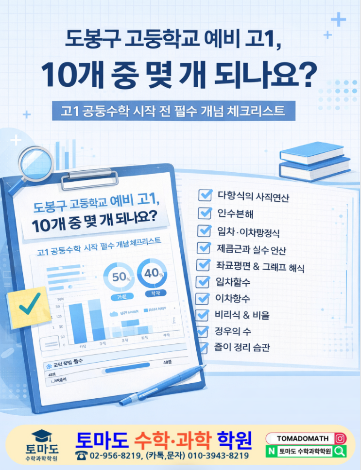 도봉구 고등학교에 진학하는 학생들, 혹은 이미 도봉구 고등학교에 재학 중인 고1 학생들에게 가장 많이 듣는 말이 있습니다. “중학교 때 수학 성적은 괜찮았는데 고등학교 수학은 왜 이렇게 어렵죠?” 이 질문의 답은 생각보다 단순합니다. 고등 수학은 새로운 내용이어서 어려운 게 아니라, 중등 개념 위에 바로 쌓이는 구조이기 때문입니다. 그래서 도봉구 고등학교 학생들에게 고1 수학을 시작하기 전 가장 필요한 것은 무작정 앞서 나가는 선행이 아니라 기초 개념이 제대로 갖춰져 있는지 점검하는 과정입니다. 왜 도봉구 고등학교 학생들은 고1에서 흔들릴까? 도봉구 고등학교 1학년 수학을 분석해 보면 시험 범위 자체는 아주 낯설지 않....... <img src="https://blogthumb.pstatic.net/MjAyNjAyMDhfMjY4/MDAxNzcwNTM4ODk4NjUx.h-0ZF6DztLLQw75rO-9ThrveY_zCGcbnuA9qEO6Pfs0g.UCFnEeLPfOa9C6uaHOYVVJldWk8auqzd1Y6OqS8a9d8g.PNG/image.png?type=s3" />