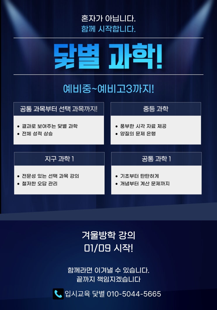 과학 고민, 닻별에서 해결하세요! 겨울방학이 시작되면서 많은 학생들과 학부모님들께서 ‘과학 과목, 어떻게 공부해야 할까?’ 하는 고민을 하고 계실 텐데요. 인터넷 강의는 왠지 믿음이 가지 않고 멀리 있는 학원을 다니기에는 시간과 체력이 부담되고 “과학까지 꼭 학원을 다녀야 할까?” 하는 생각까지 여러 가지 이유로 과학 공부를 망설이는 경우가 많습니다. 하지만 입시 정책이 계속 변화하는 지금, 과학 과목은 더 이상 ‘곁다리 과목’이 아닙니다. ✔ 과학 과목, 선택이 아닌 필수입니다 고2, 고3이 되면 선택 과목 중심의 시간표가 구성되면서 학생들은 자신의 진로에 맞는 과목만을 선택하게 됩니다. 이 과정에서 필요하지 않다고....... <img src="https://blogthumb.pstatic.net/MjAyNjAxMTJfNTUg/MDAxNzY4MjA4NDczNDU4.3T7WSqu-030PFxlyGbZTyCHb3QwJxhHxFXX4vcFKCqIg.yQr-g0jZQq98bddL5BbmP6Jou-jDztOguWdZNy84ed8g.JPEG/%BB%E7%BA%BB_-%C1%A6%B8%F1%C0%BB_%C0%D4%B7%C2%C7%D8%C1%D6%BC%BC%BF%E4_%284%29.jpg?type=s3" />