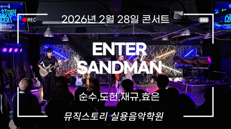 안녕하세요~ 뮤직스토리 실용음악학원입니다~ 이번 2월 28일 공연 영상입니다~~ 엄청 유명한 메탈리카~~~ 엔터샌드맨의 노래인데요~ 제가 고등학교때 공연했던 곡입니다~~~~ㅋㅋ 거의 30년 된거 같아요~~ㅋㅋㅋ 오랬만에 했는데 너무 즐겁네요~~~ 순수가 엔터샌드맨 연습하고 있길래~~공연하자고 했습니다~~ 합주하는동안 너무 즐거웠어요~~ 순수야 도헌아 너무 잼있다~~ㅋㅋ 즐겁게 봐주세요~~~ 감사합니다~~~ <img src="https://blogthumb.pstatic.net/MjAyNjAzMTBfMjU0/MDAxNzczMTQxMjg3OTQz.r-ObU0eHNpTlHH5FryiNvvk-o6JC2mpbWn7p6NAAXmcg.xNVf_LMRgsUldzGEcbAgqYgHRIhe8o-EAvvf2bl-gJ4g.JPEG/%25EC%2597%2594%25ED%2584%25B0_%25EC%259C%25A0%25ED%2588%25AC%25EB%25B8%258C.jpg?type=s3" />