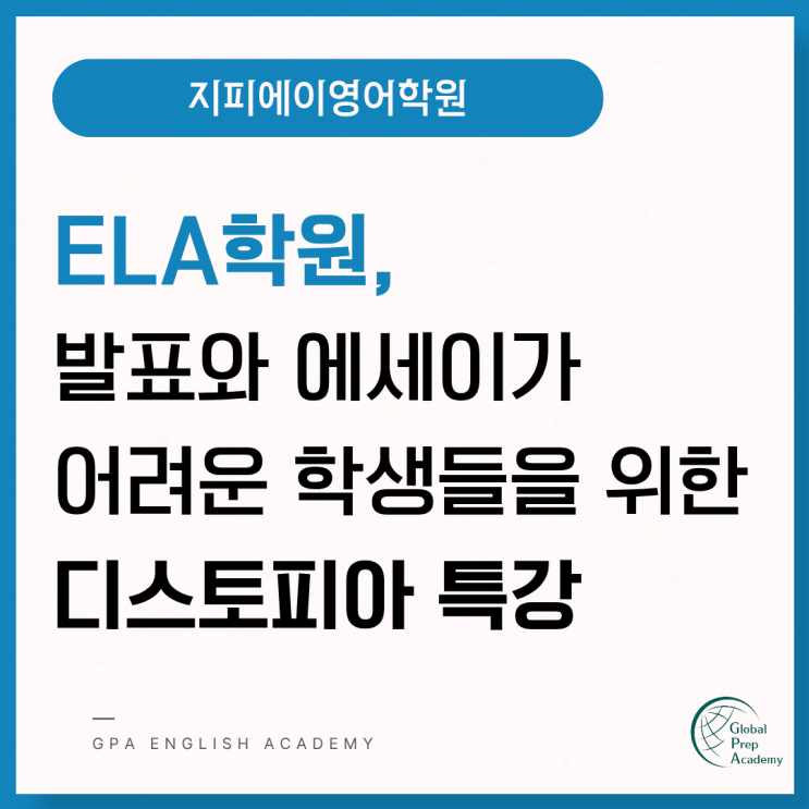 안녕하세요. 지피에이영어학원 원장 정승주입니다. ELA 수업을 찾는 학생들 중에는 이런 고민을 가지고 있는 친구들이 있어요. 선생님 저는 책을 읽어도 막상 줄거리를 말해보라고 하면 힘들어요.. 에세이를 쓸 때도 첫 줄부터 막혀요.. 시험 성적만 보면 영어를 잘하는 것처럼 보이는데, 막상 발표를 하면 입이 안 떨어지고.. 에세이를 작성하려고 하면 첫 줄부터 막히는 상황.. 특히 유학이나 국제 학교를 준비하는 학생들은 고민이 많을 수밖에 없습니다. 곧 현지에 나가서 영어로만 대화를 해야 하는데 글로 쓰는 것도, 대화하는 것도 버겁다면 덜컥 겁이 나기 마련이죠. 그래서 오늘은 국제 학교 교과목인 ELA 수업과 이 과목을 어려워하는....... <img src="https://blogthumb.pstatic.net/MjAyNjAzMTdfMjQ2/MDAxNzczNjk5MzMxMzMz.zACu1Cw_9fP1JhhQHFhtcwQVzbapkg4xaFYiI5NmQBsg.zMrNfDwnC1c-e2ZpQqak99p18JLsE2QS4NAZ10xyeiQg.PNG/1.png?type=s3" />