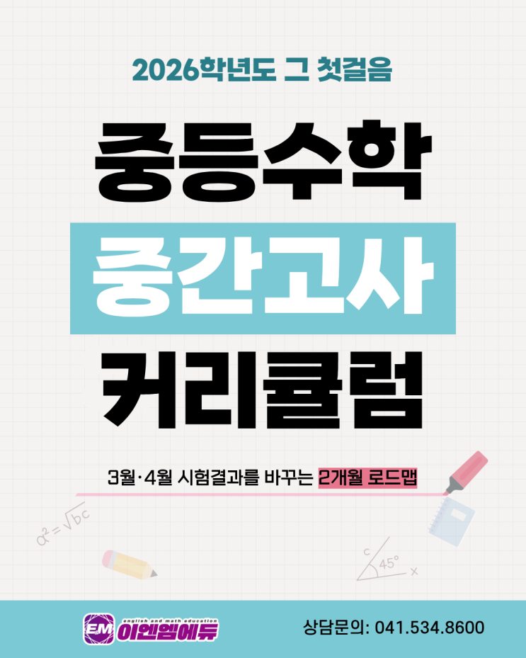 THE NEXT STANDARD ENMEDU 안녕하세요 아산 중고등 영어수학 전문학원 #이엔엠에듀 입니다 새학기가 되어 이엔엠에듀의 중등부 수업에 많은 관심을 보여주고 계십니다 시험 성적은 단기간이 아닌 지금부터의 과정에서 결정됩니다. 3월부터 시작하는 이엔엠에듀의 중등부 수학 수업을 안내해드리겠습니다 3월과 4월, 시험결과를 바꾸는 2개월 로드맵 3월 주교재 중심의 시험범위 개념학습 클리닉을 통한 주간 점검 시스템 → 빈틈 없는 학습 완성 매주 테스트 후 오답노트 작성 → 부족 개념 강화 3월 말, 시험대비 보강 돌입 4월 이엔엠에듀 자체제작 시험대비 교재로 집중학습 교과서 N제 풀이 → 다양한 유형 학습 자체제작 모의고사 실시 → 실....... <img src="https://blogthumb.pstatic.net/MjAyNjAzMTlfMTIg/MDAxNzczOTIzMzMyMzYw.j1Z644FUGyFvRhgdQf7mZ_1MuiKDYCVB2V5o49zpuWQg.2Gx36uZVXg1zOIIE33xVjYgPXxHzNM1Ta9n-7AcnX74g.PNG/1.png?type=s3" />