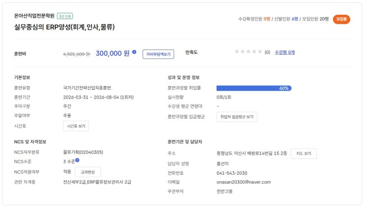 안녕하세요?? 아산 유일 국비지원 학원 온아산직업전문학원입니다~ 오늘은 2026년 3월 온아산직업전문학원에서 교육 진행이 확정된 국비과정 2과정을에 대한 안내와 수강신청 방법을 소개 드리고자 합니다. 2026년 상반기 구직/취업 이외 이직 또는 자격증 취득을 준비하시는 분께서는 잘 살펴보신 후 학원으로 바로 연락 주시기 바랍니다. 훈련비의 65% ~95% 지원(교재포함)이므로 다른 과정보다 마감이 빠를 수 있습니다. [기초경리회계실무(전산회계 1,2급] 교육일정: 2026년 3월 31일(화)~06월05일(금) 교육시간: 화, 수, 목 13:00~18:00(5시간/일) * 06.01~06.05 수업은 월, 화, 목, 금요일 13:00~18:00(5시간/일) 수강신청 링크 ↓ 지원내....... <img src="https://blogthumb.pstatic.net/MjAyNjAzMTlfMTc1/MDAxNzczODkzMjI1Nzg1.xvJVsr5Re3vgfftsVpNft4_8GdAAboELRcip_TgU3u8g._DdYAwV40rJ9cdbK0-OgrsEf84zhQ9P_ri2fDCweJ9Ug.JPEG/ERP.jpg?type=s3" />