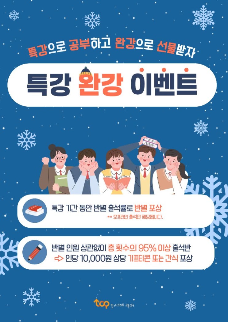 안녕하세요 탑씨크리트 아산원입니다! 아산원에서는 다음 주부터 겨울방학 특강이 시행됩니다! 추운 겨울, 학습이 느슨해질 수도 있는 시기일 텐데도 많은 학생들이 특강을 신청해 주었습니다. 이런 학생들 위하여 소소한 이벤트를 준비했습니다! 특강 기간 동안 출석률이 좋은 반을 선정하여 소정의 선물이 증정되며 특강 후엔, 학생들을 대상으로 만족도 조사를 시행하게 됩니다! 그냥 수업만 하는 것으로 끝이 아니라 우리 학생들이 무엇이 좋았고, 무엇이 아쉬웠는지에 대한 피드백을 철저히 받아 볼 예정입니다! 학부모님들께서는 많은 관심 부탁드리며, 우리 학생들은 적극적인 참여 부탁드립니다! 탑씨크리트 아산원 Tel:041-546-0475 <....... <img src="https://blogthumb.pstatic.net/MjAyNjAxMDlfMjA3/MDAxNzY3OTUxODc1MTY4.xoSORbdWjreaCMX_H9_zYQ6eQKBrMmYrKbaWmk7eRxgg.Wz14-oMA3Axo4hoOTof1l6lcF4fslsVMsxS00Os2vEog.JPEG/KakaoTalk_20260108_213137928.jpg?type=s3" />