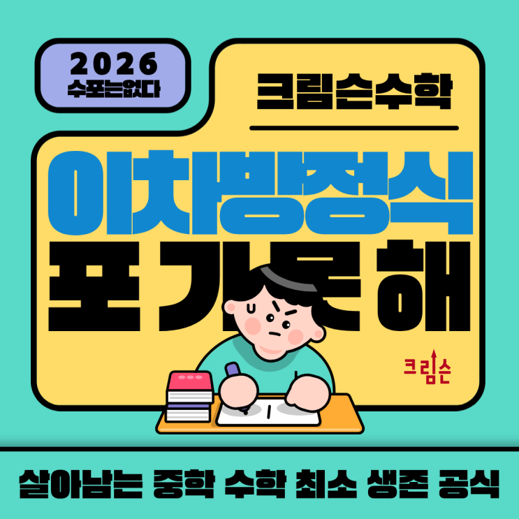 안녕하세요, 아산 용화동 크림슨학원입니다. 중3 수학의 최대 난관, 바로 이차방정식입니다. "x²이 갑자기 왜 나와요?" "인수분해? 근의 공식? 다 처음 보는 건데요." "풀이 방법이 너무 많아서 뭘 써야 할지 모르겠어요." 이차방정식은 일차방정식보다 복잡해 보이지만, 풀이법은 딱 3가지뿐이에요. 그중에서도 하나만 제대로 익히면 충분합니다. 오늘은 수포자도 따라 할 수 있는 이차방정식 최소 생존 공식을 알려드릴게요. 왜 이차방정식에서 막힐까? 일차방정식은 이랬죠. 2x + 3 = 7 x = 2 그런데 이차방정식은 x²이 들어가요. x² - 5x + 6 = 0 x가 2제곱이 되면서 답이 2개가 나옵니다. x &....... <img src="https://blogthumb.pstatic.net/MjAyNjAyMDdfMTE2/MDAxNzcwNDIxOTcyODI0.eLcSLk6_Unn3CzvzvnNeTl2iolFDWSeuBHP_WNNVI1og.0wmKNNnk93jzgg2hYwZU_HoUl2FT8lsfrXS5ARoFtbQg.PNG/%BC%F6%C6%F7%B1%DD%C1%F6_%282%29.png?type=s3" />