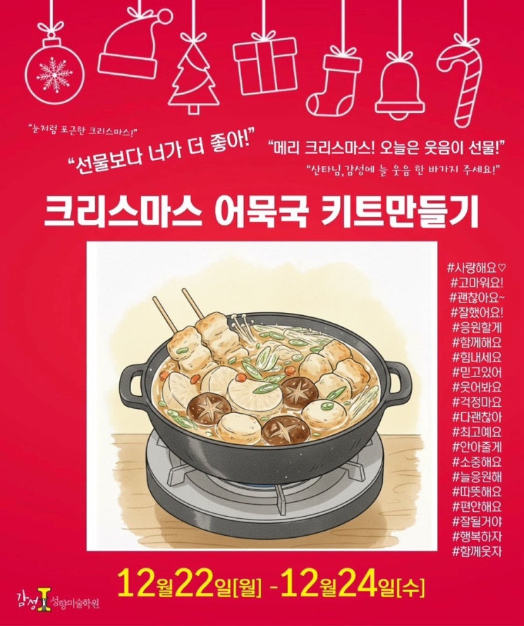 크리스마스 준비 중! 어묵탕 키트 만들기 DAY 안녕하세요! 아산탕정 감성I성향미술학원입니다!! 크리스마스를 맞아 아이들과 함께 어묵탕 키트 만들기를 준비하고 있어요 먼저 담아갈 용기 뚜껑에 각자 나만의 어묵탕 그림을 그려보는 시간부터 시작 ✍️ 동글동글한 용기 위에 어묵 따뜻한 국물 다양한 재료들 그리고 아이들만의 상상력까지 더해지니 ✨ 키트를 모두 완성한 뒤에는 떡볶이도 나눠 먹고 크리스마스 분위기 속에서 사진도 찍으며 아이들과 즐거운 시간을 보낼 예정이에요 만드는 시간부터 함께 웃고 함께 먹고 함께 추억을 남기는 시간까지 따뜻하고....... <img src="https://blogthumb.pstatic.net/MjAyNjAxMDVfNjgg/MDAxNzY3NTgxMDEzNDk4.gHH1Ej4p0F1BxphEGQwXQ_YsSEIANlq4uzfdq-rCESsg.cfENkQ1Tj-q4ylQus-7RmexDAEsCK9FwnIQ43RllQA8g.JPEG/IMG%A3%DF1408.JPG?type=s3" />