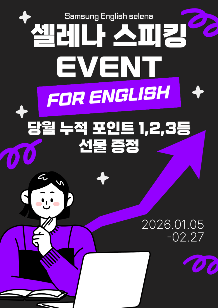 ️ 말하는 영어를 만드는 시간 셀레나 스피킹 EVENT 안내 영어 공부를 오래 했는데도 막상 말하려고 하면 입이 떨어지지 않는 아이들, 많이 보셨죠? 단어는 알고, 문법도 아는데 ‘말로 꺼내는 힘’은 또 다른 훈련이 필요합니다. 그래서 삼성영어 셀레나에서는 아이들이 영어를 입으로 쓰는 경험을 자연스럽게 쌓을 수 있도록 셀레나 스피킹 이벤트를 진행합니다. 셀레나 스피킹 EVENT란? 이번 이벤트는 단순한 게임이나 발표가 아닙니다. 아이들이 매일 수업 속에서 쌓아온 영어 표현을 직접 말해보고, 누적 점수로 성취감을 느끼는 구조입니다. 수업 중 스피킹 참여 배운 표현을 활용한 말하기 꾸준함이 점수로 누적되는 방....... <img src="https://blogthumb.pstatic.net/MjAyNjAxMDlfMTU0/MDAxNzY3OTM1NjUwMjEz.z_HNHOesRC6vPXhyViSZv47VUi753-acJnXKjJFuOP8g.GoIZL4322SX5QoUjweusYZ286y9EOf2NU1UEgzOTg00g.PNG/%C1%A6%B8%F1%C0%BB_%C0%D4%B7%C2%C7%D8%C1%D6%BC%BC%BF%E4._%2821%29.png?type=s3" />