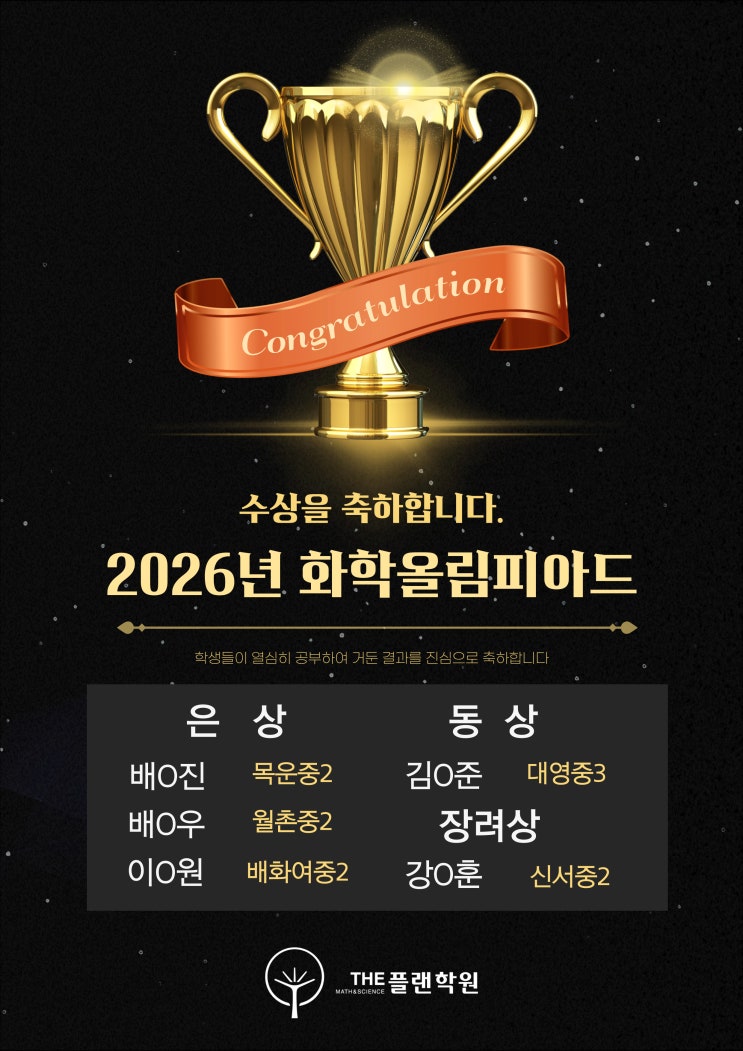 2026년 1차 중학생 화학대회(KMChO)에서 겨울 방학동안 열심히 준비한 수강생 전원 수상을 축하합니다!! <img src="https://blogthumb.pstatic.net/MjAyNjA0MDJfNzcg/MDAxNzc1MTIxMjM3Njg1.17LPDESXZCwmquc-L94xL7OL8DtDPt08iqg067qnfoUg.F0b4VgNBCuphc0jygznRwhpoa74C_53O_BsrHucyDpUg.JPEG/26%B3%E2_%C8%AD%BF%C3_%BC%F6%BB%F3%C0%DA.jpg?type=s3" />