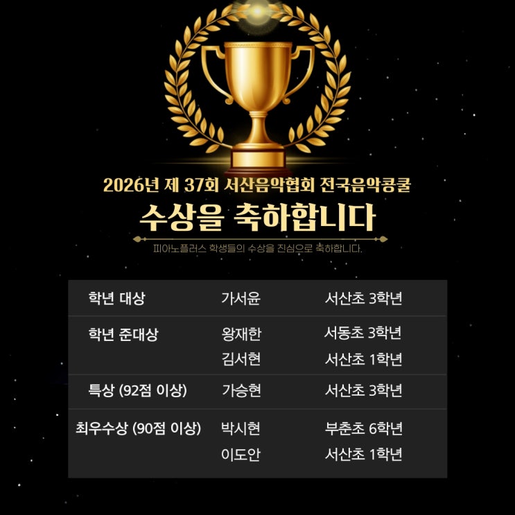 아이들이 피아노라는 새로운 악기를 접하고, 오랜 시간 동안 꾸준히 연습하며 노력한 결과가 이렇게 멋진 결과물로 나타난 것 같아 정말 기쁩니다. 피아노를 배우는 과정은 단순히 악기를 연주하는 법을 배우는 것 이상입니다. • 끊임없는 반복 연습을 통해 인내심을 기릅니다. • 어려운 곡을 마스터하며 성취감을 맛봅니다. • 음악을 통해 감성을 풍부하게 가꿉니다. 이러한 모든 과정들이 아이들의 성장에 큰 도움이 될 것이라고 확신합니다. 이번 트로피 수상을 계기로 아이들이 더욱 자신감을 가지고 피아노에 흥미를 느끼기를 바랍니다. 저희 학원은 앞으로도 아이들이 음악을 통해 더욱 풍요로운 삶을 살아갈 수 있도록 최선을 다해 지....... <img src="https://blogthumb.pstatic.net/MjAyNjAzMjNfMTQg/MDAxNzc0MjM2MTY3NzAw._AMtVywWDyse9CHeu7tR0X4xD71neWyQjwyIq30CQvYg.pLbPZbB2y6X-Ow8qtoUbJ5u3RoF5XRbEl9K9F36O_DUg.PNG/900%A3%DFGridArt%A3%DF20260323%A3%DF120327953.png?type=s3" />