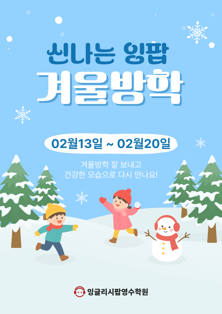 안녕하세요! 잉글리시팝 영수학원입니다. 유난히 추웠던 겨울도 어느덧 정점을 지나고 있습니다. 우리 잉팝 아이들이 그동안 학원에서 열정적으로 공부하며 달려온 만큼, 잠시 재충전하며 에너지를 채울 수 있는 겨울방학 기간을 갖게 되었습니다. 포스터의 내용처럼 아이들이 신나게 뛰어놀고, 가족들과 소중한 추억을 쌓는 행복한 시간이 되길 바랍니다. <img src="https://blogthumb.pstatic.net/MjAyNjAyMTJfNjUg/MDAxNzcwODg2MDkyMDE5.eFc39x91sBBqNOPmdwMNCqSYh-NTQy_DMO9lsbfCqNQg.v0DEqm-_tPyebAccAdgyQzawVJWo-zfxL_0tGrls2xEg.PNG/%C1%A6%B8%F1%C0%BB_%C0%D4%B7%C2%C7%D8%C1%D6%BC%BC%BF%E4._%2813%29.png?type=s3" />